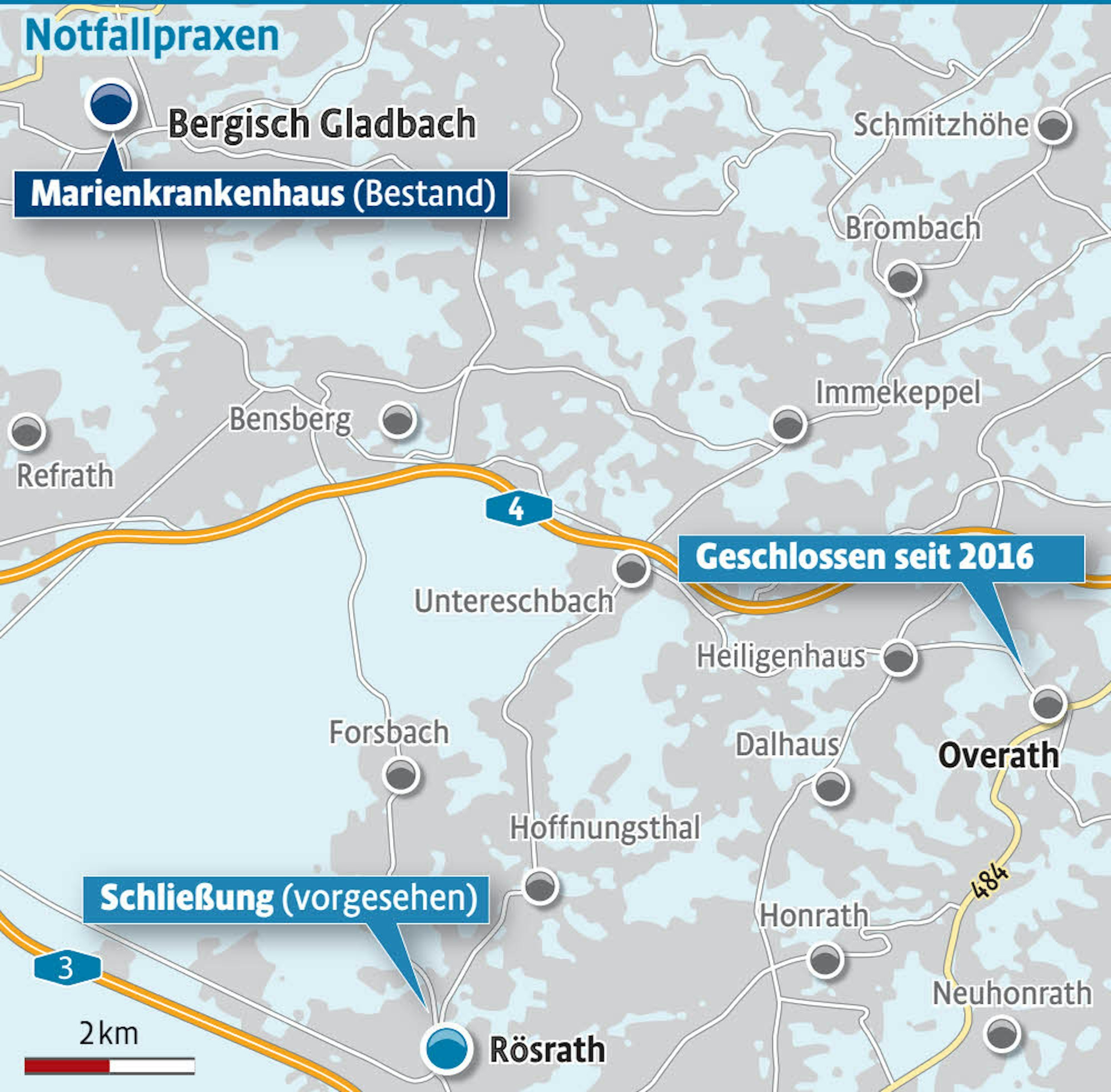 Wie die Kassenärztliche Vereinigung Nordrhein, die die Notdienstpraxen führt, mitteilt, gehe es vor allem um eine „Angleichung der Dienstbelastung“ der Ärzte vor Ort. Die Schließung bedeute für die Rösrather Ärzte eine Entlastung, da sie künftig wie die Bergisch Gladbacher Ärzte in der Notfallpraxis in Gladbach eingeteilt würden.