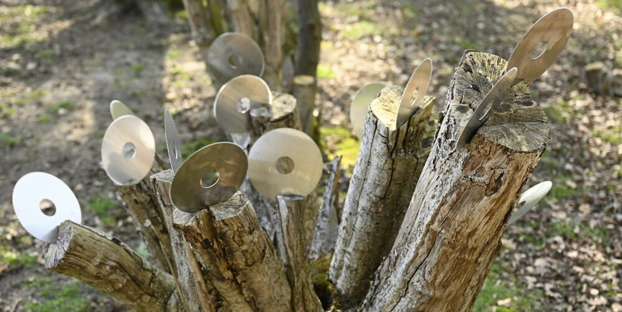 Von einem Baumstumpf hat sich auch Rosemarie Bruchhausen inspirieren lassen, sie hat dort 13 metallisch glänzende Sägeblätter arrangiert. Ein paar Schritte weiter hat sie eine ehemalige Treppenstufe aus Sandstein in das Skulpturenpark-Gelände gepflanzt.