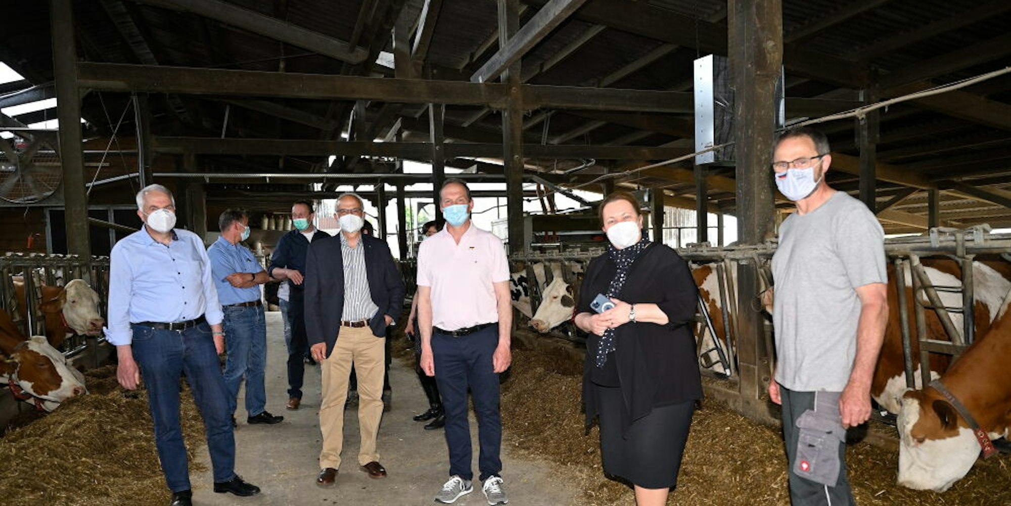 Im Kuhstall von Lambert Stöcker (r.) trafen sich Rainer Deppe, Uli Heimann, Michael Braun und Landwirtschaftsministerin Ursula Heinen-Esser (v. l.).