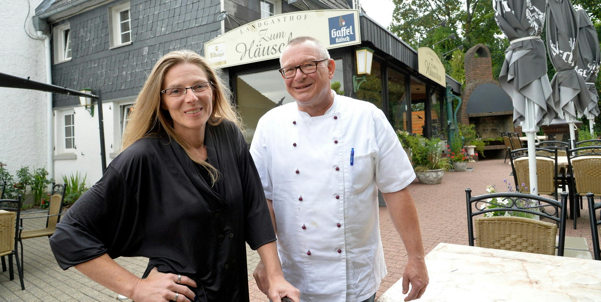 Witwe Melanie Opfer und Küchenchef Volker Strauß im Biergarten des Gasthofs „Zum Häuschen“ in Oberschönrath.