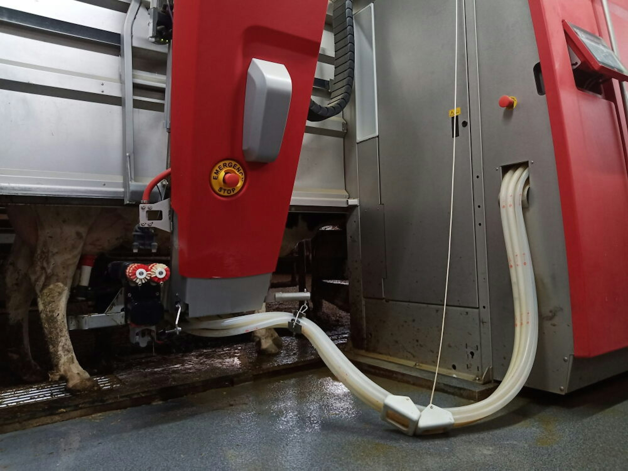 Das Gerät ist begehrt: Drei Kühe stehen Schlange. Über einen Chip im Ohr der Kuh erkennt der Roboter, wie viel Milch eine Kuh an einem Tag bereits gegeben hat und ob ihre Zeit schon wieder gekommen ist. „Manche probieren es trotzdem zwischendurch, denn für die Tiere ist das sehr angenehm“, sagt Stöcker.