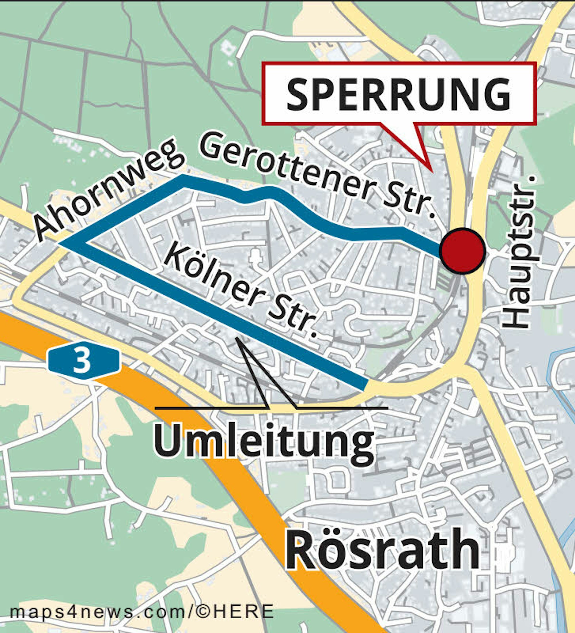 Für Autofahrer aus Richtung Hoffnungsthal und Forsbach wird die Fahrt in die Ortsmitte Rösrath dagegen noch aufwendiger, als sie durch die einseitige Sperrung der Hauptstraße ohnehin schon ist: Von der Kreuzung Bensberger Straße/Gerottener Weg zum Sülztalplatz dauert es damit vier Minuten länger – allerdings nur bei normaler Verkehrslage, die angesichts der Umleitung nicht zu erwarten ist.