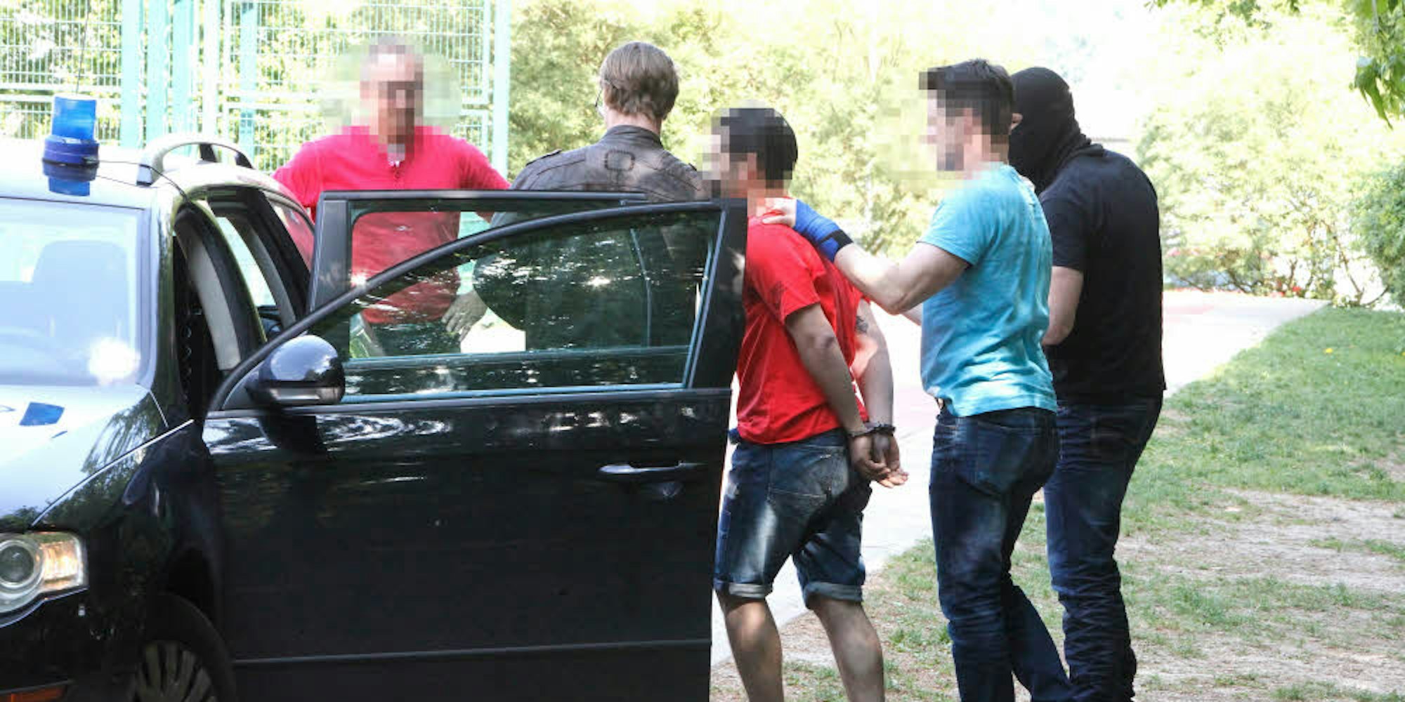 In Handfesseln führen die Fahnder eines Spezialeinsatzkommandos den Verdächtigen zu einem Auto.