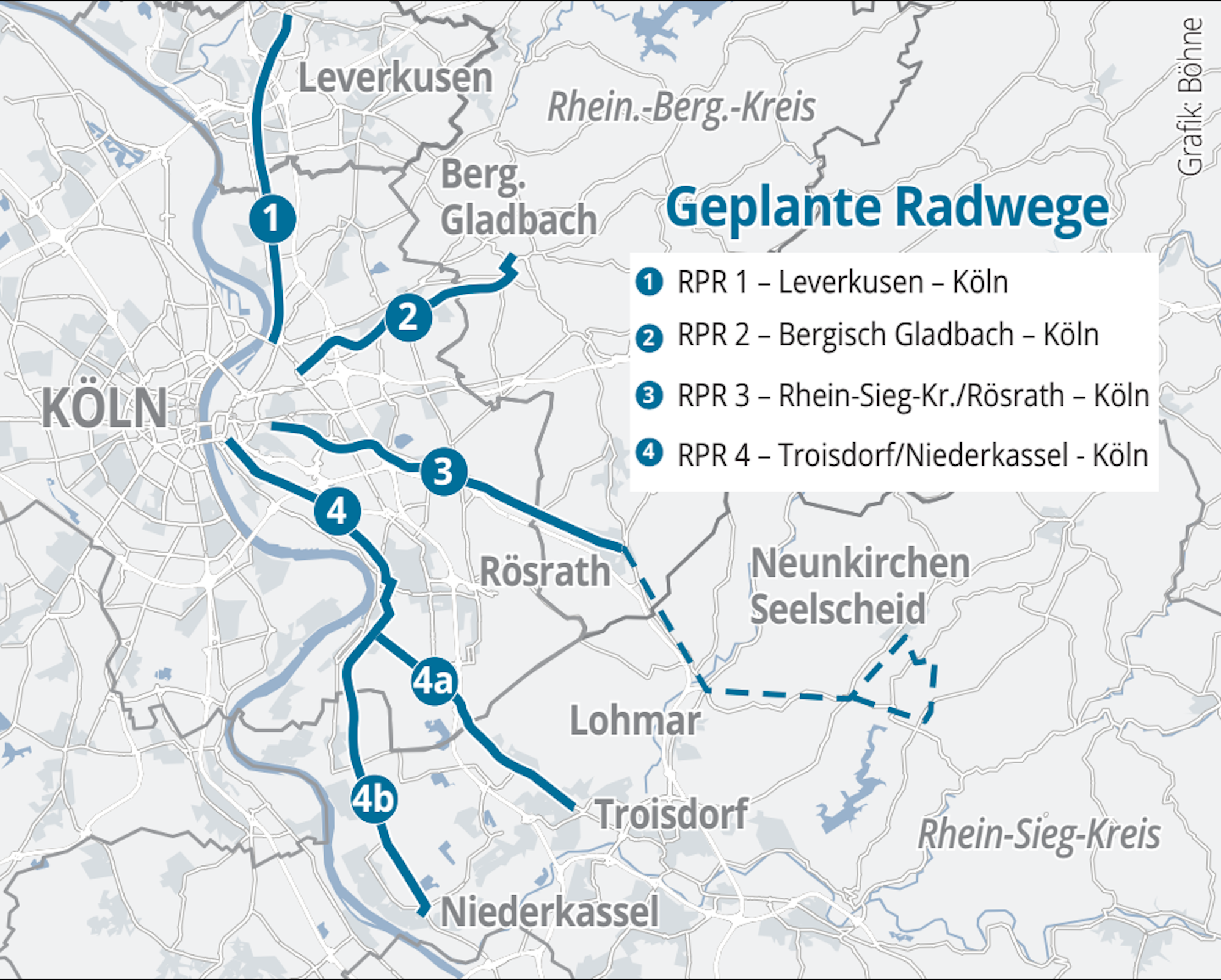 Mit einem Planungsleitfaden, den alle Kommunen akzeptiert haben, gibt es inzwischen gemeinsame Standards für die Gestaltung der geplanten Radverbindungen, die von Köln nach Leverkusen, nach Bergisch Gladbach, nach Rösrath sowie nach Troisdorf und Niederkassel führen sollen.