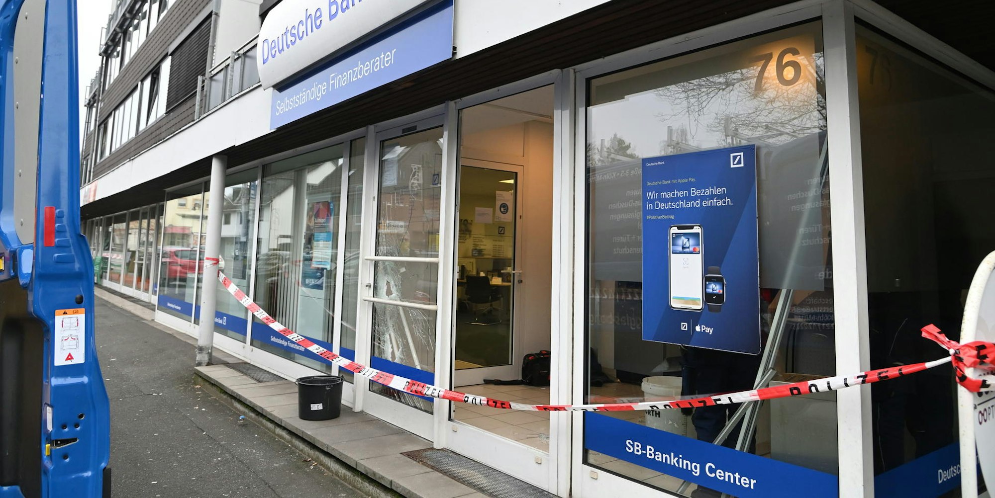 Rösrath – Durch beherztes Rufen haben Anwohner laut Polizei wahrscheinlich die Sprengung eines Geldautomaten der Deutschen Bank-Filiale an der Hauptstraße in Rösrath verhindert. Gegen 1.45 Uhr waren Bewohner des Hauses, in dem sich auch die Bankfiliale befindet, laut Polizei durch ein lautes Geräusch auf zwei dunkel gekleidete Personen mit Sturmhauben aufmerksam geworden, die sich vor der Bankfiliale befanden.