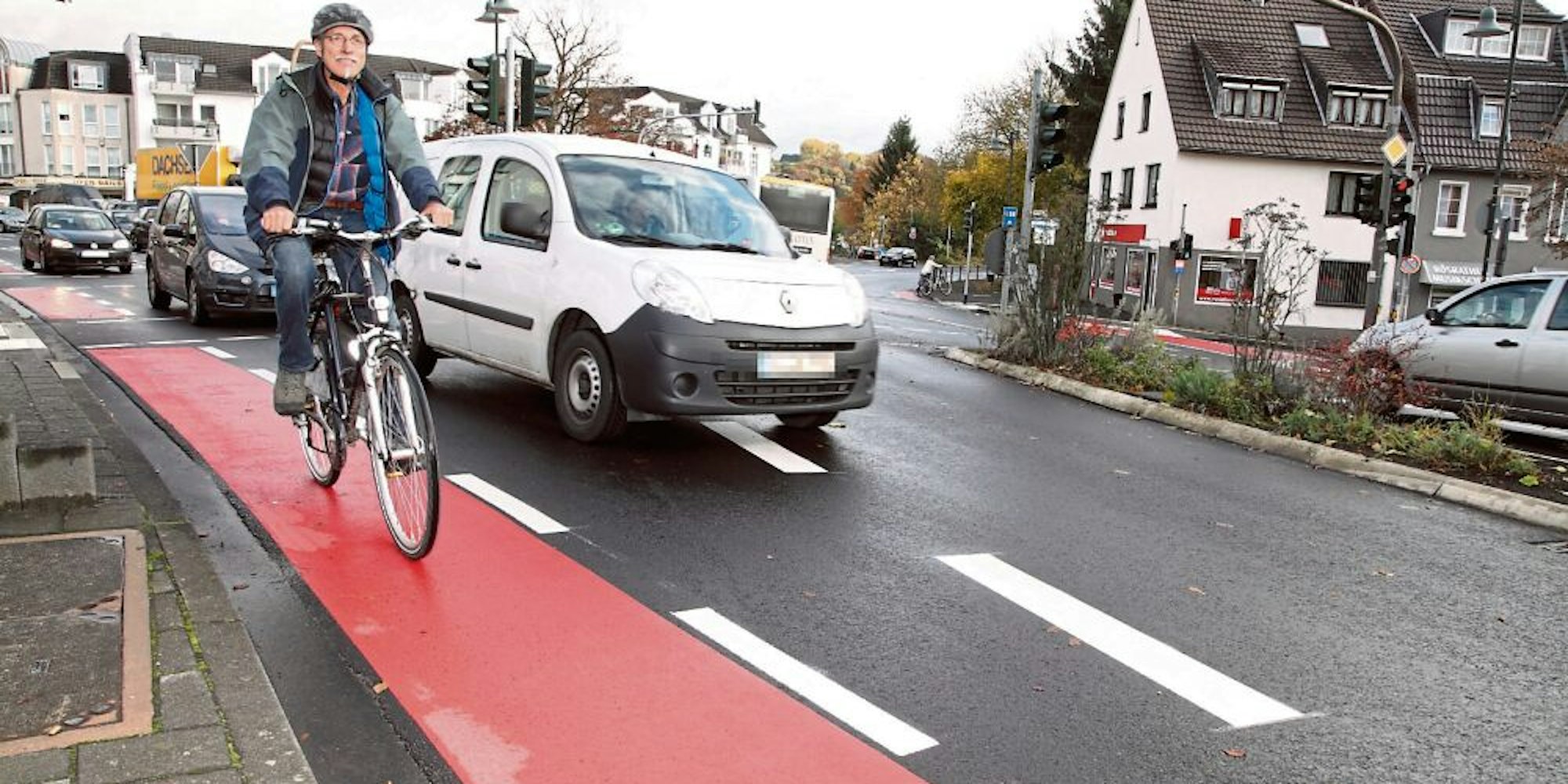 Rote Markierungen (wie hier am Sülztalplatz) fördern die Sicherheit von Radwegen und Radstreifen.