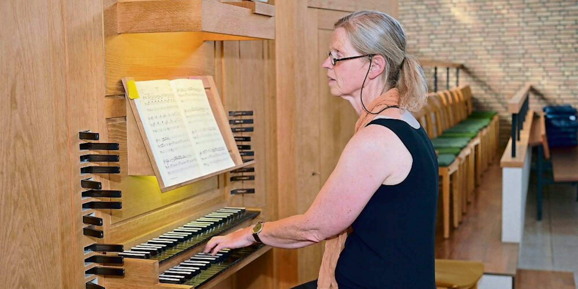 Doris Röskenbleck an ihrem Arbeitsplatz, der Orgel der Rösrather Versöhnungskirche.