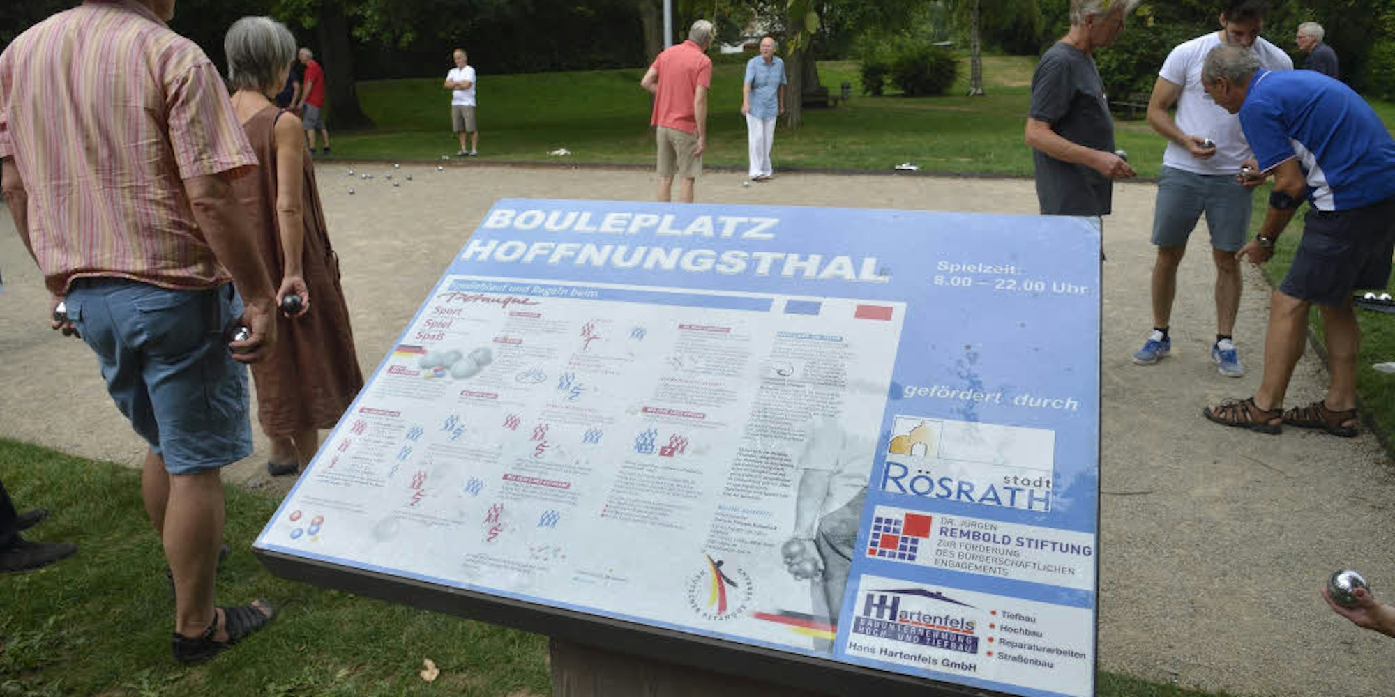 Die Idee für den Bouleplatz kam ursprünglich von Rösrather Bürgern, das Projekt wurde dann von der Rembold-Stiftung und dem Rösrather Bauunternehmen Hartenfels ermöglicht. Ein wichtiges Anliegen für Stifter Jürgen Rembold ist die Förderung des Engagements der Bürger. Auch Christoph Nicodemus, Rösrather Beigeordneter, betonte, wie ideal die Bedingungen des neuen Platzes sind. In der Nähe befinden sich sanitäre Anlagen, ein Eiscafé ist direkt um die Ecke, und damit auch im Winter bis in den Abend hinein gespielt werden kann, errichteten die Stadtwerke eine Platzbeleuchtung. Glücklicherweise sei der Park weit genug entfernt von Wohnhäusern. „Da kann man schon mal verrückt werden, wenn man ständig die Geräusche der Kugeln hört“, so Nicodemus.