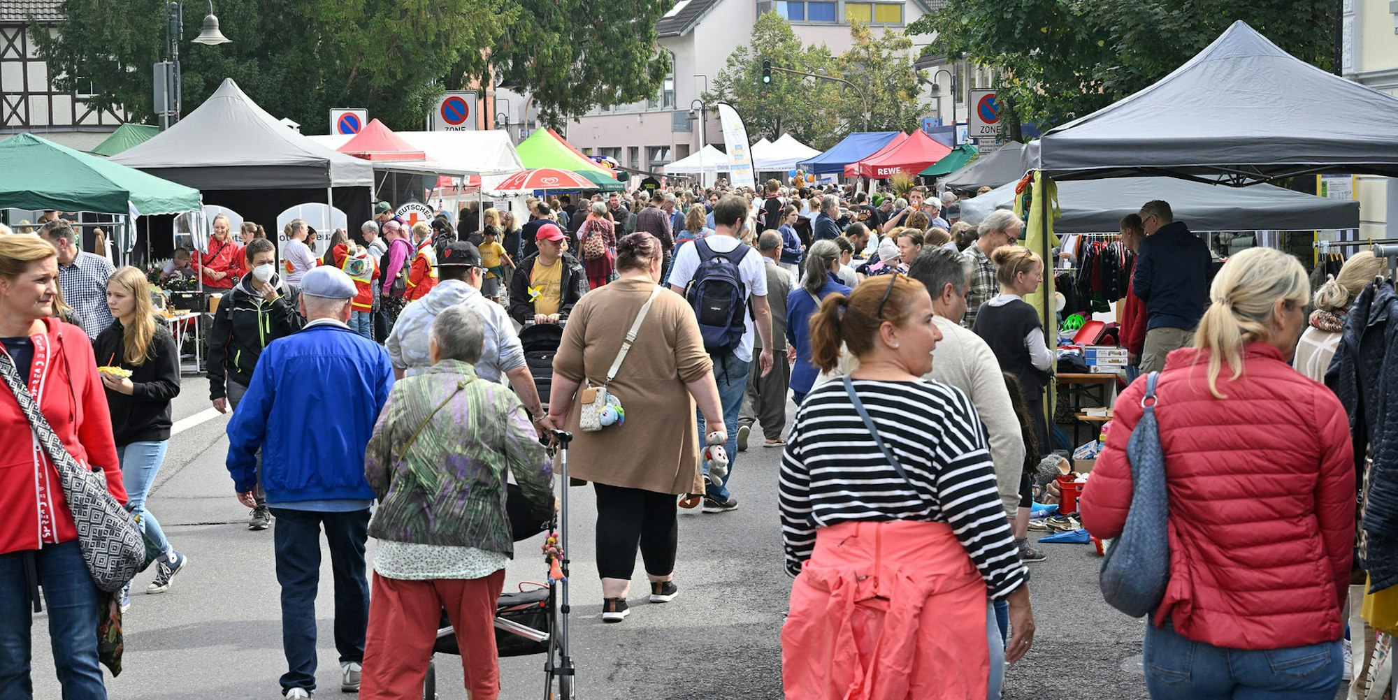 Und wie gefeiert wurde! Die Hauptstraße war von der Evangelischen Kirche Volberg bis zur Tankstelle mit privaten Trödelangeboten und Infoständen von Vereinen übersät. Dazwischen wimmelten tausende Kaufinteressierte. Vor einem Jahr undenkbar: „Wo wir hier stehen, waren wir bei einem Meter Wasserstand“, wusste Müller. Am Sonntag verglichen dagegen Kinder ihre neuen Spielsachen und Studenten ergatterten günstige Schallplatten.