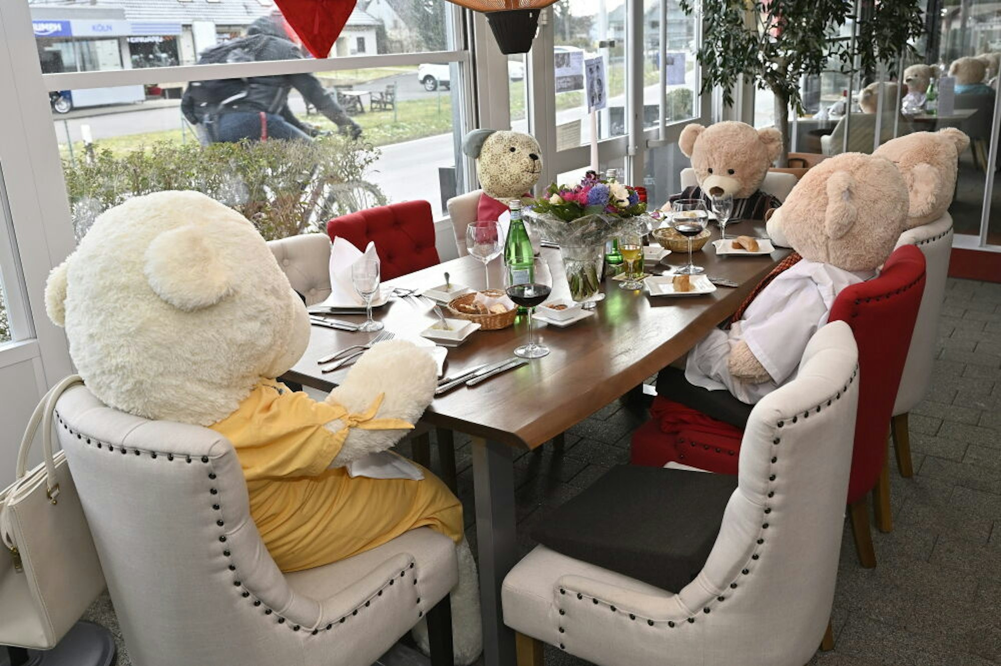 Eine besondere Idee präsentiert das Team des Lehmbacher Hofs nicht nur mit der Speisen-Lieferung zu Wohnwagen. In Zeiten des Lockdowns sorgt die Betreiber-Familie auch für Leben an den verwaisten Tischen des Restaurants: Dort ist eine Teddybärenfamilie platziert, die in geselliger Runde tafelt. Sie ist durch die Fenster zu sehen, was viele Blicke von Vorübergehenden anzieht. „Die Bären sind ein Symbol, dass wir uns nicht unterkriegen lassen“, sagt Ivanka Gabriele. „Sie geben mir das Gefühl, dass ich nicht allein bin.“ (tr)