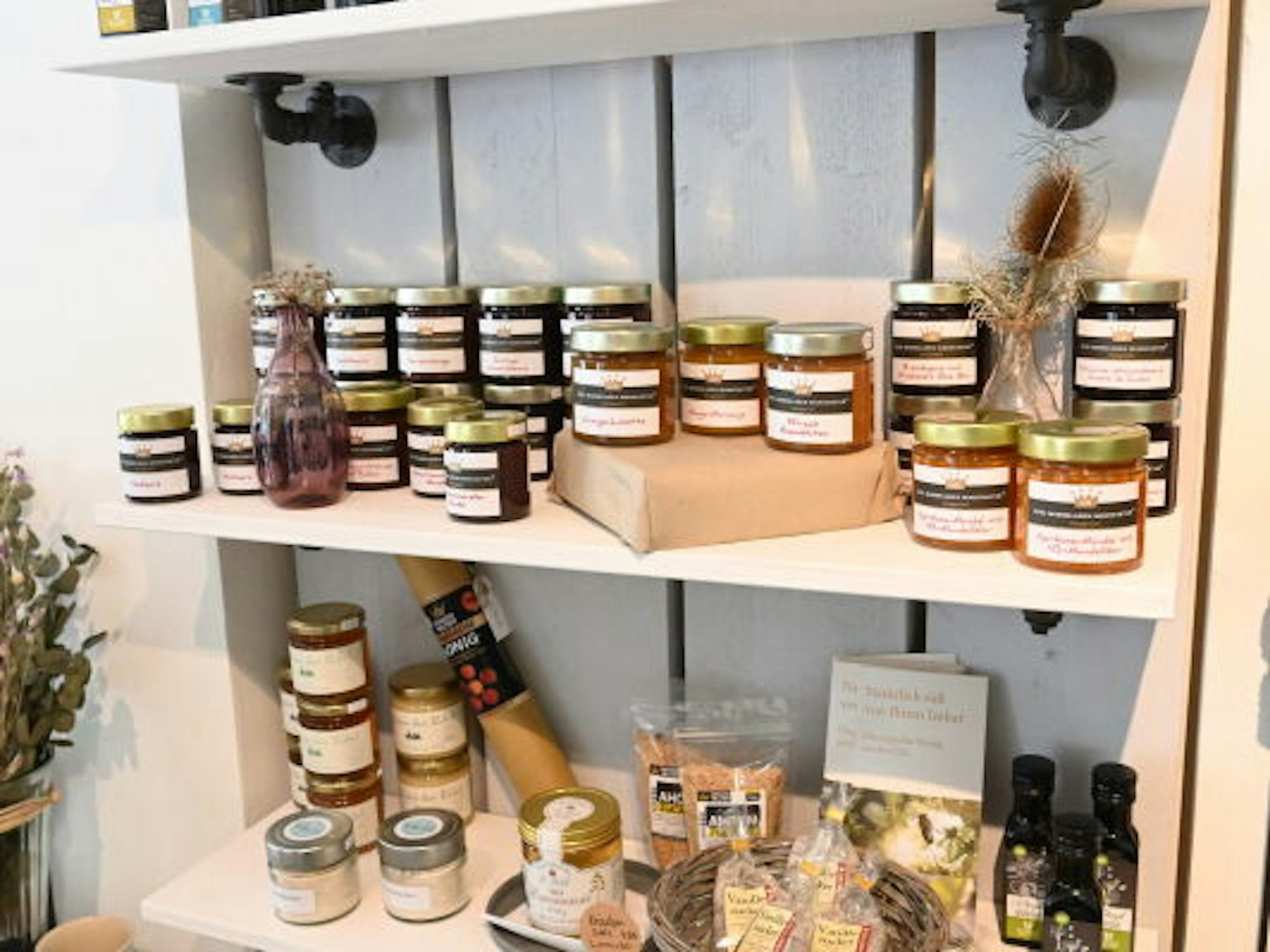 Für ihren Einzelhandel hat die Wahl-Rösratherin ganz bewusst Produkte aus kleinen Manufakturen gewählt, die möglichst keine Zusatzstoffe verarbeiten: Schokolade aus Erfurt, Marmelade aus der Eifel, Bio-Honig, Bio-Kaffee, Essig, Öl, Gewürze, Kaffeelikör aus Köln oder Hochprozentiges aus einer norddeutschen Brennerei. Feine Handarbeiten wie Eiermützen oder Kinderschürzen sind bei den Accessoires ebenso zu finden wie Seifen, Gläser und Utensilien für die Küche.