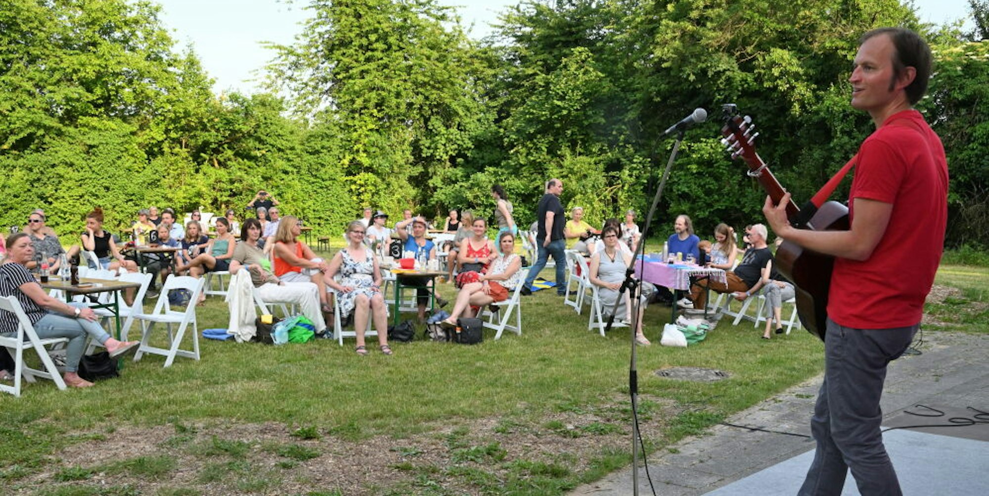 Rösrath – „Dies ist die allererste Veranstaltung in diesem Jahr hier“, freut sich Schlossmanagerin Lisa-Ann Borgmann auf der Wiese von Schloss Eulenbroich mit dem Sänger-Songwriter Mathew James White und dem Publikum, das ganz entspannt an den Tischen und auf den mitgebrachten Decken sitzt – ein Picknickkonzert mit Biergarten-Feeling ist angesagt, gerade passend an diesem heißen Abend.