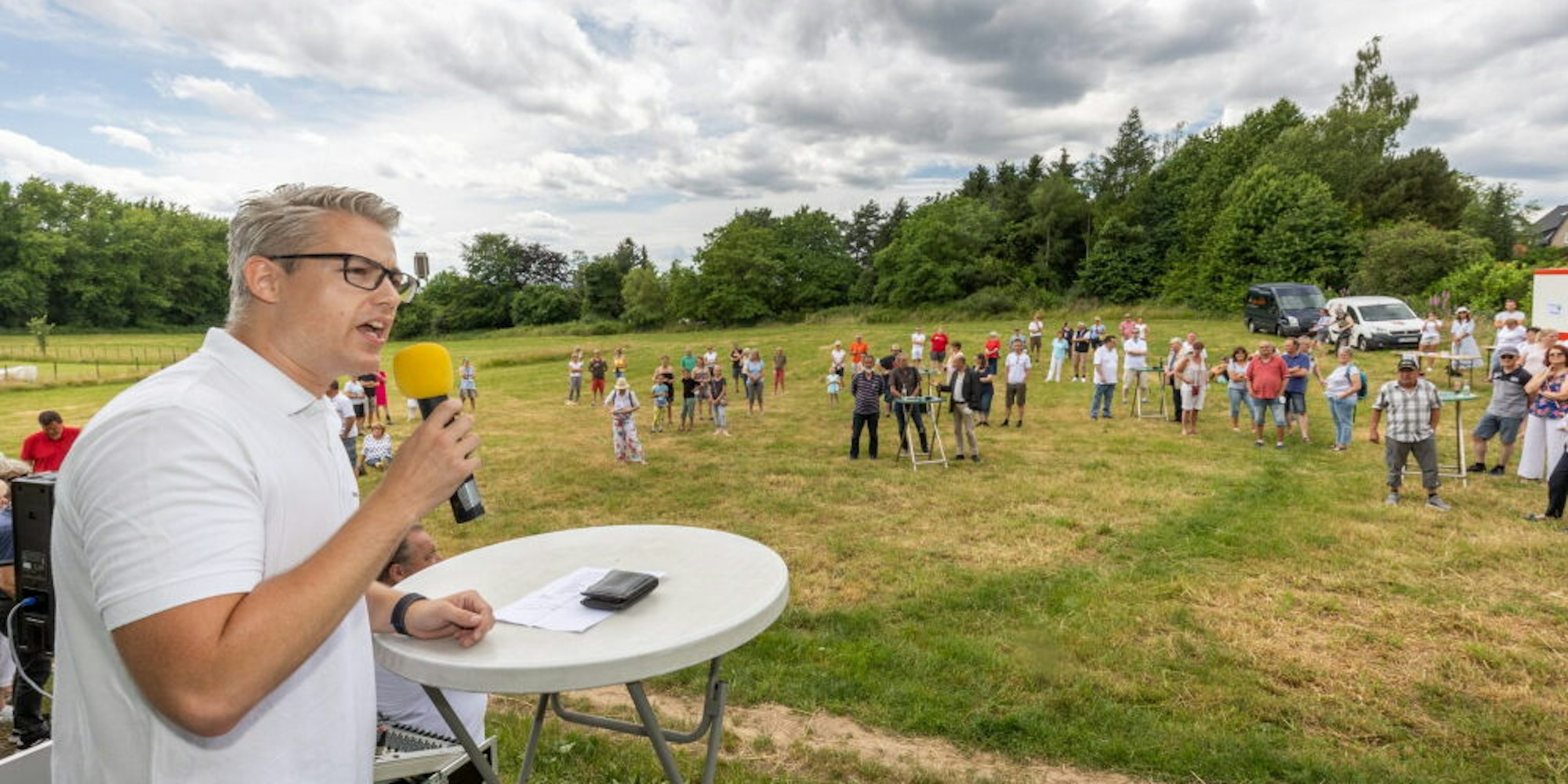 Auf einer Anhängerfläche steht Yannick Steinbach, Fraktionsvorsitzender von Fors-Park, und argumentiert durchs Mikrofon für die Ablehnung des Bebauungsplans „Heidchenwiese“ in der Sitzung des Stadtrats am 28. Juni: „Was bleibt von Rösrath, wenn wir von einem Betonklotz zum nächsten gucken?“ Es sei unredlich zu sagen, man wolle mehr Bürgerbeteiligung und einen Leitbildprozess, und dann dieses umstrittene Vorhaben vorab schnell durchzuziehen – ohne Einbeziehung der Bürger in der Leitbilddiskussion. Damit bezieht er sich auf die Abstimmung im Planungsausschuss, dort haben CDU und Grüne den Bebauungsplan abgesegnet – die Fraktionen SPD, FDP, AfD, ZLR und Linke enthielten sich.