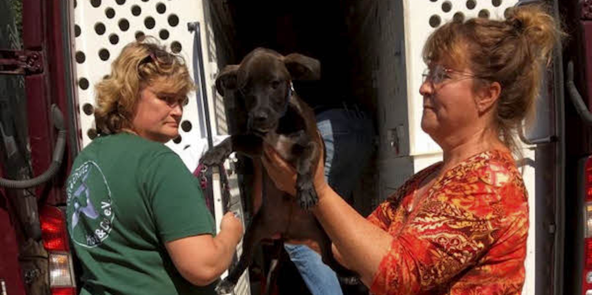 Die ehrenamtlichen Helfer tragen einen Hund aus dem Transporter, der gerade aus Spanien angekommen ist. Mehrere Tage hat die Reise für den Hund gedauert.