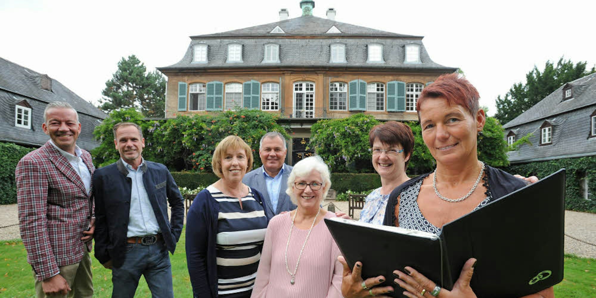 Alle Leichlinger Standesbeamtinnen vor dem Schloss: (von rechts) Alexandra Wiegratz, Brigitte Gutendorf, Ulrike Wildt und Heidrun Glage mit (von links) Matthias Winzer und Manfred Ackermann vom Eicherhof und Bürgermeister Frank Steffes.