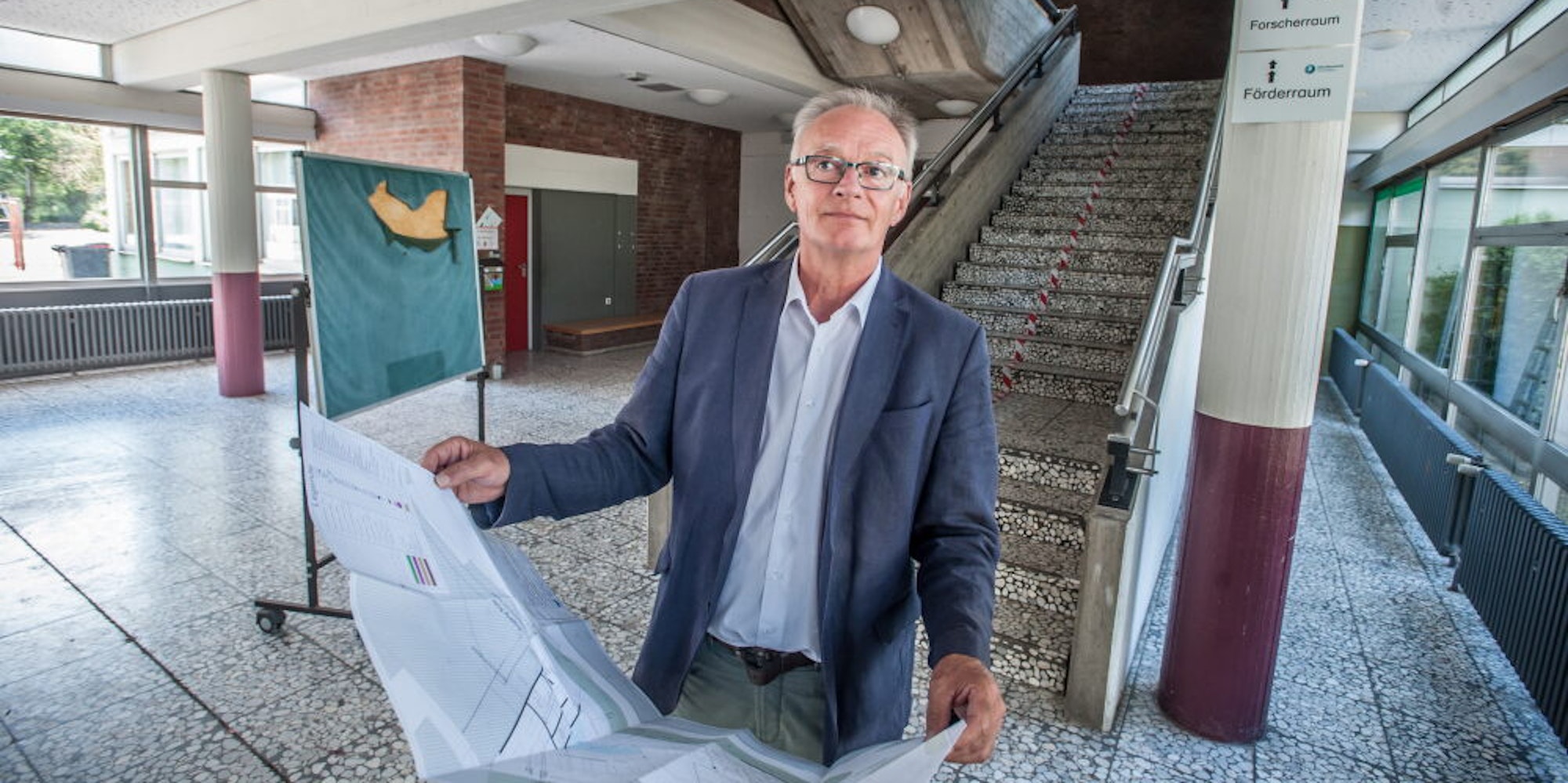 Wolfgang Kalski mit den Umbauplänen in der Grundschule Büscherhof.