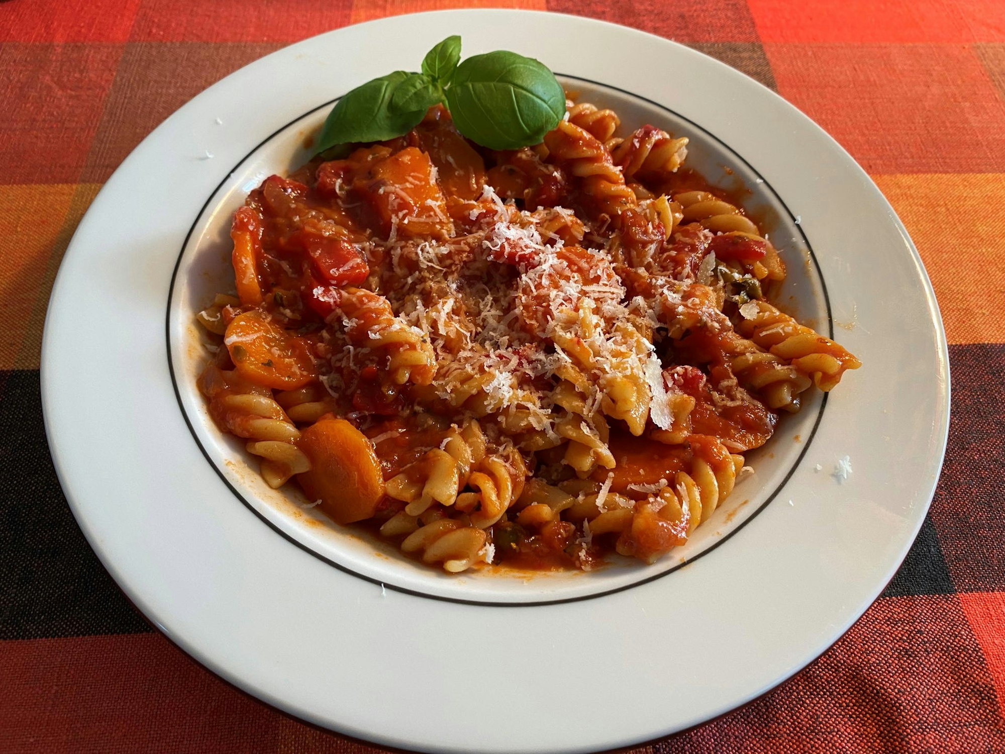 Nun geht es los: Zwiebeln und Knobi klein gewürfelt, in Olivenöl anbraten, gescheibelte Möhren und Sellerie dazu, Paprika gewürfelt, mit andünsten. Dann mit gehackten Tomaten ablöschen, würzen, rohe Nudeln unterrühren, mit wenig Wasser (und Gemüsebrühe) auffüllen, bis die Nudeln knapp bedeckt sind. Bis zur gewünschten Bissfestigkeit köcheln lassen, immer mal umrühren. Da die Nudeln beim Kochen Stärke abgeben, ergibt das eine herrlich schlotzige Konsistenz. Darüber Parmesan frisch hobeln.