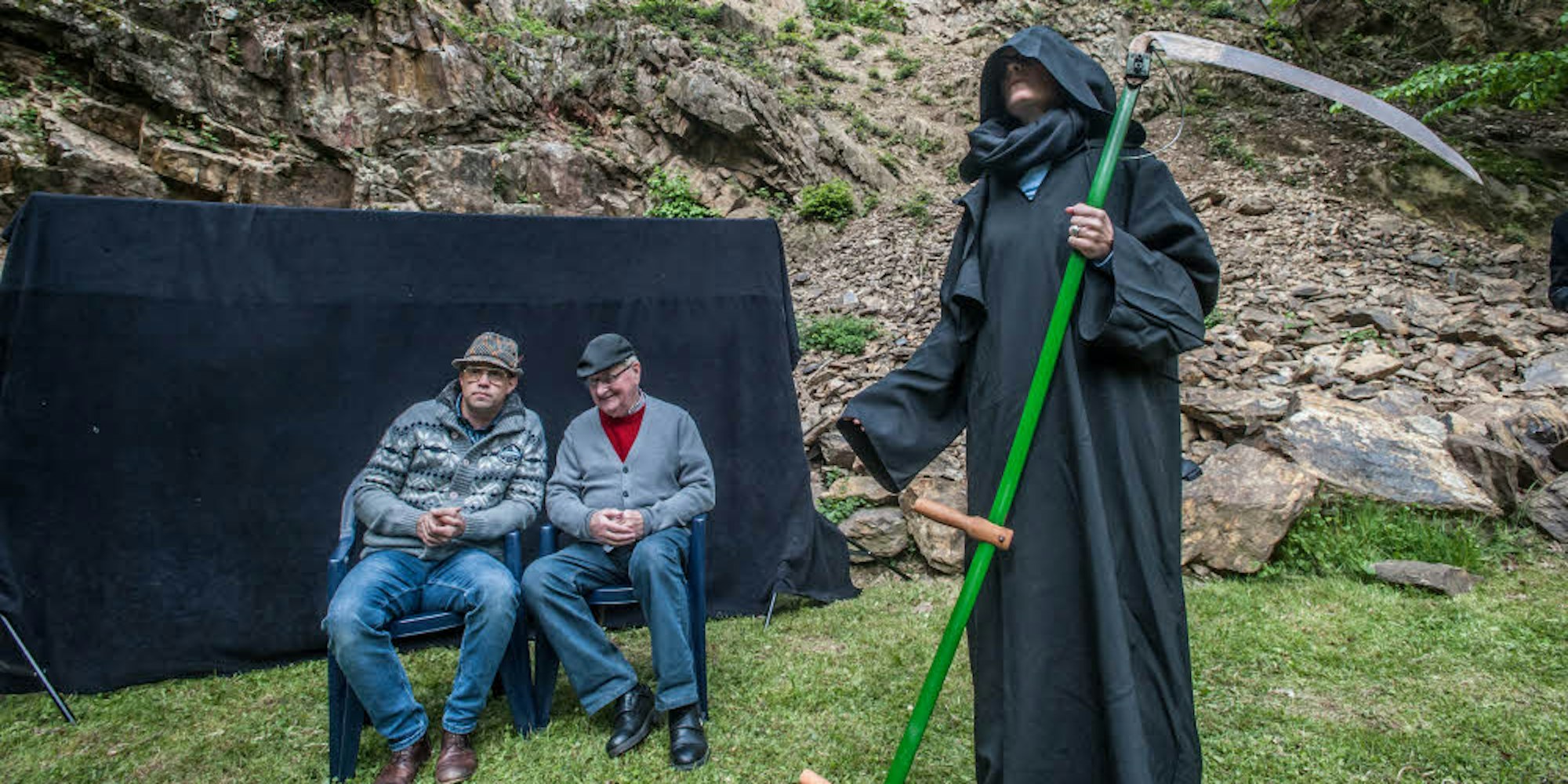 Die Ausstellungsbesucher verfolgten alle drei Szenen gespannt, konnten sich einige Schmunzler nicht verkneifen. „Am Anfang zeigen wir die Neugier für die Jugend als Spielplatz, danach folgt im Erwachsenenalter die Neugier des Kennenlernens und schließlich die Neugier auf den Tod“, erklärte die Leiterin des Hitdorfer Theaters, Martina Vikanis. Denn die Frage, was das nächste Level nach dem Tod sei, spiele im Alter durchaus eine Rolle. Das Schauspieler-Duo Helmut Kuhnhenn und Sven Klatte wagte sich in den Rollen der Sauerländer Erwin und Kasulke an philosophische Fragen. Angefangen beim Kernthema der Neugier ging es hin zu Gedankenspielen über möglicher Events im Himmel nach dem Tod – ein charmanter Gedankenausflug.