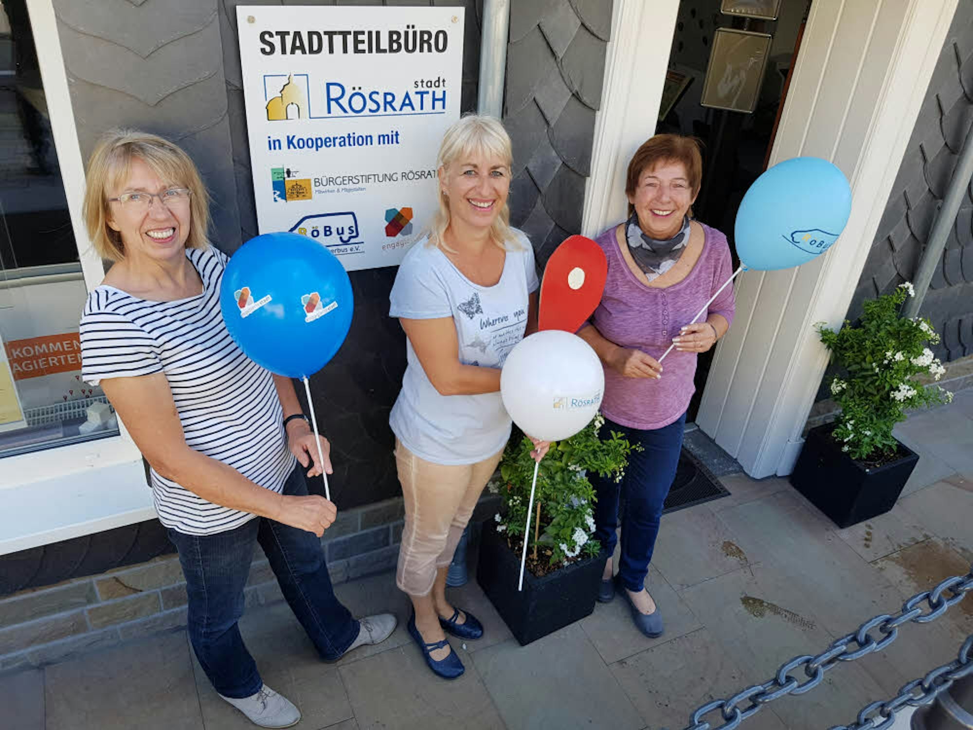 Auch im Stadtteilbüro dreht sich alles um das Straßenfest. Stadt-Mitarbeiterin Gabi Koßmann und Ehrenamtler von „Engagierter Stadt“ und Bürgerbus-Verein bereiten das Büro für den Besucheransturm vor. Anne Koch kommt herein und fragt nach einem Schild „Rösrath passt auf“ – und Roswitha Hoge erkundigt sich gleich bei ihr, ob sie nicht ein Ehrenamt suche. Koch zeigt sich nicht abgeneigt: Voraussichtlich im Februar geht sie in den Ruhestand. „Dann ist Unruhestand angesagt“, kündigt sie an. Hoge freut sich: „Ich schaue in die Gesichter der Leute und überlege, wer vielleicht zu gewinnen ist für Ehrenamt.“ Dagmar Breunsbach will so auch beim Straßenfest neue Mitstreiter gewinnen. Auch Tafel-Vorsitzender Dr. Gerd Wasser sucht Freiwillige: „Wir brauchen dringend weitere ehrenamtliche Fahrer und Beifahrer, um die Lebensmittel einzusammeln“, sagt er und freut sich, dass Zeitungsfotograf Klaus Daub bei der Tafel angefangen hat, als er in den passiven Teil seiner Altersteilzeit gewechselt ist. Weitere Interessenten könnten sich gerne bei ihm unter (0 22 05) 8 29 26 melden, sagt Wasser