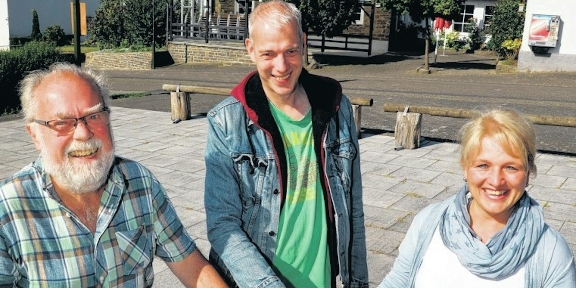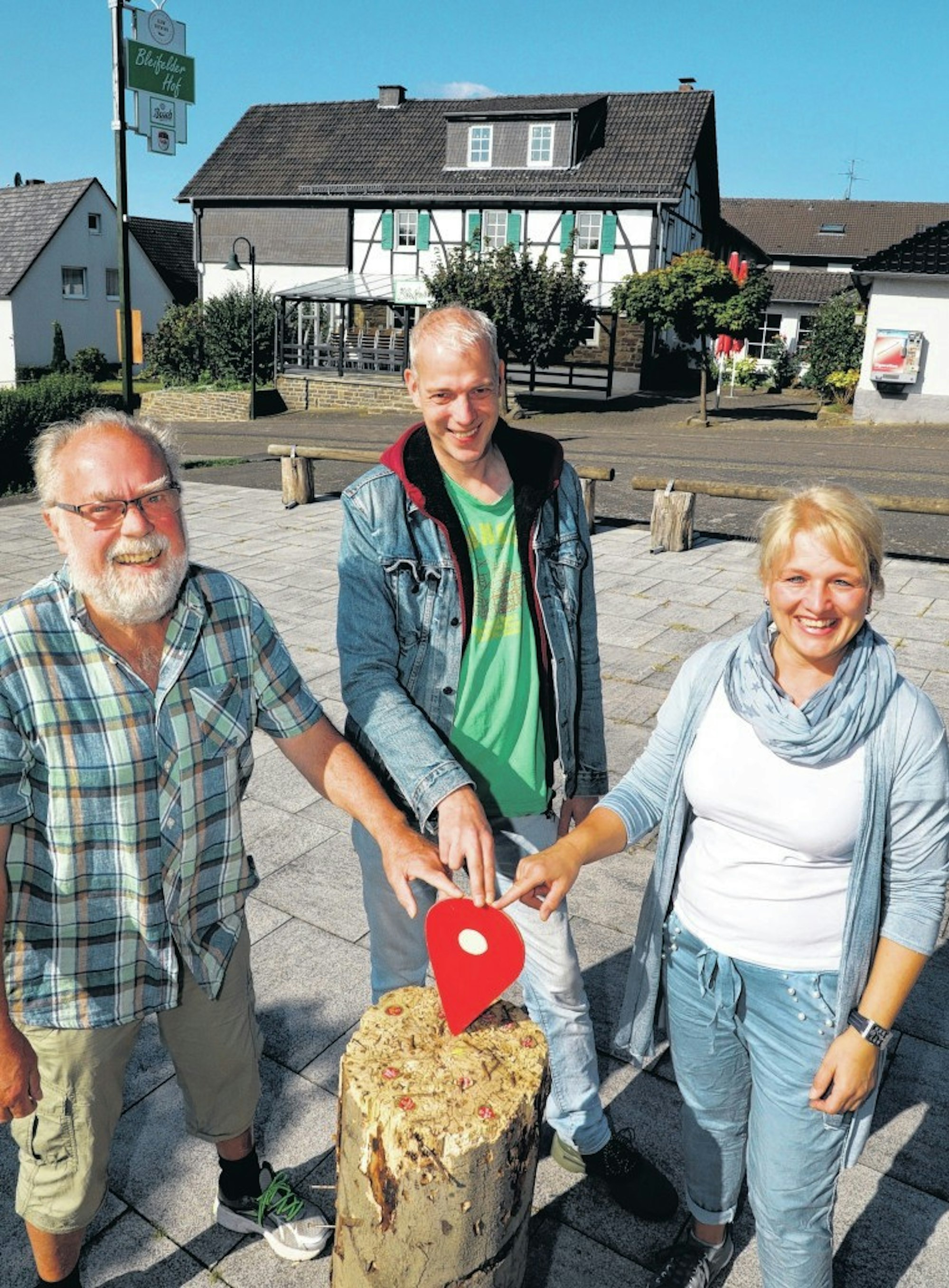 Dorfplatz und Bleifelder Hof (hinten) sind für Heike Schminke und Wolfgang Volberg (l.) sowie Neubürger Klaus Pehle der Mittelpunkt.