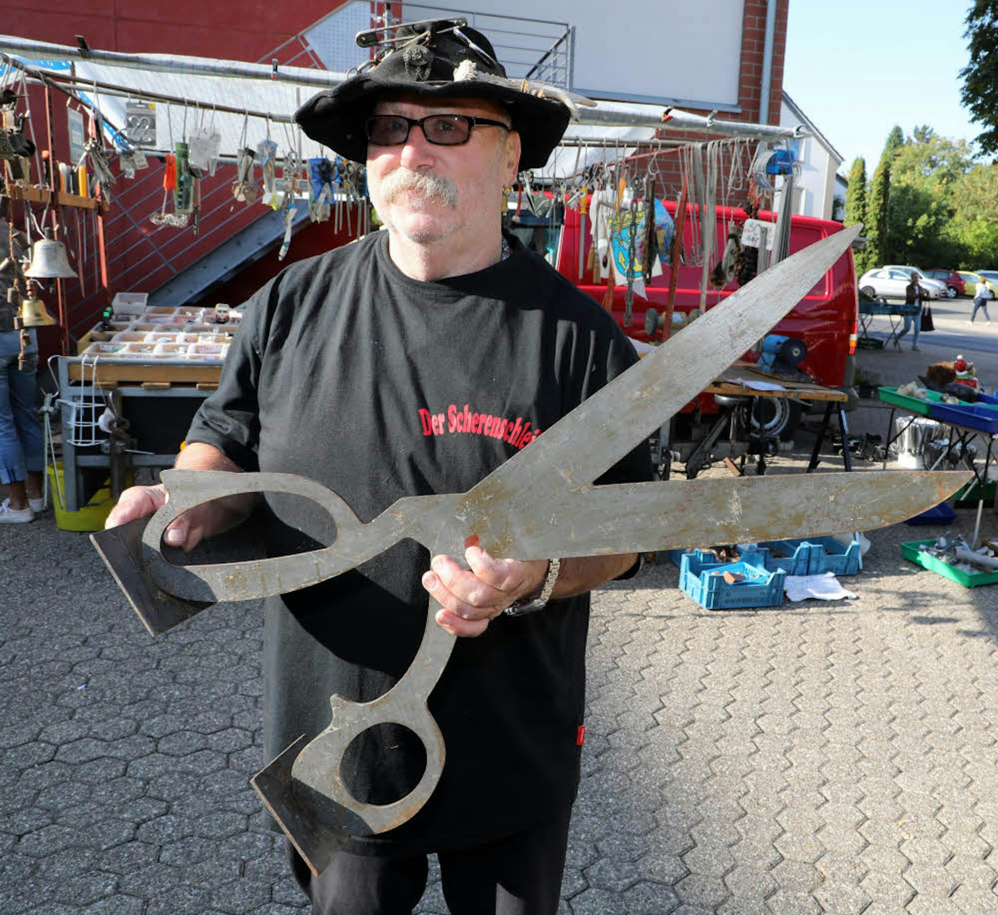 Ein paar Meter weiter überwiegt Metall am Stand von Friedhelm Kotthaus. „Ich komme alle 14 Tage hierher“, sagt der 69-Jährige, der nicht nur Scheren und Messer schleift, sondern auch verkauft. „Eigentlich ist es nur noch ein Hobby“, sagt der Rentner, der Scherenhärter in Solingen gelernt hat und heute in Witzhelden lebt. Er hat noch eine besondere Metallspezialität im Angebot: besonders große Skalpelle aus chirurgischem Stahl.