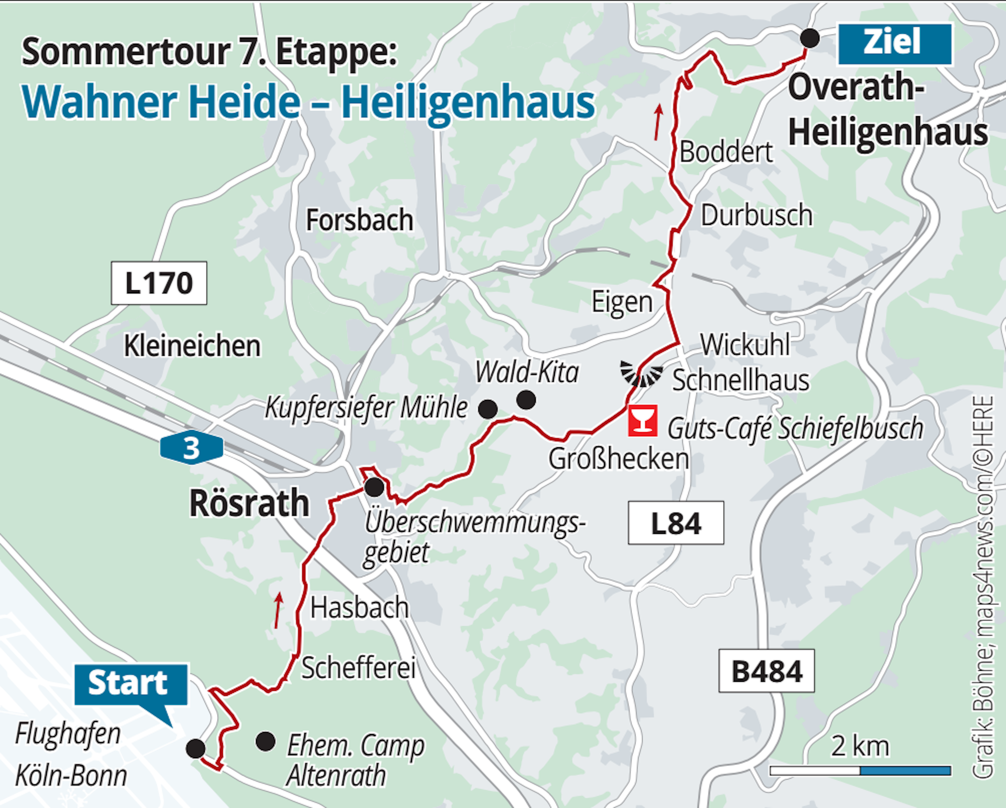 Start: Südlichster Punkt des Kreisgebiets in der Wahner Heide (auf Rösrather Stadtgebiet)