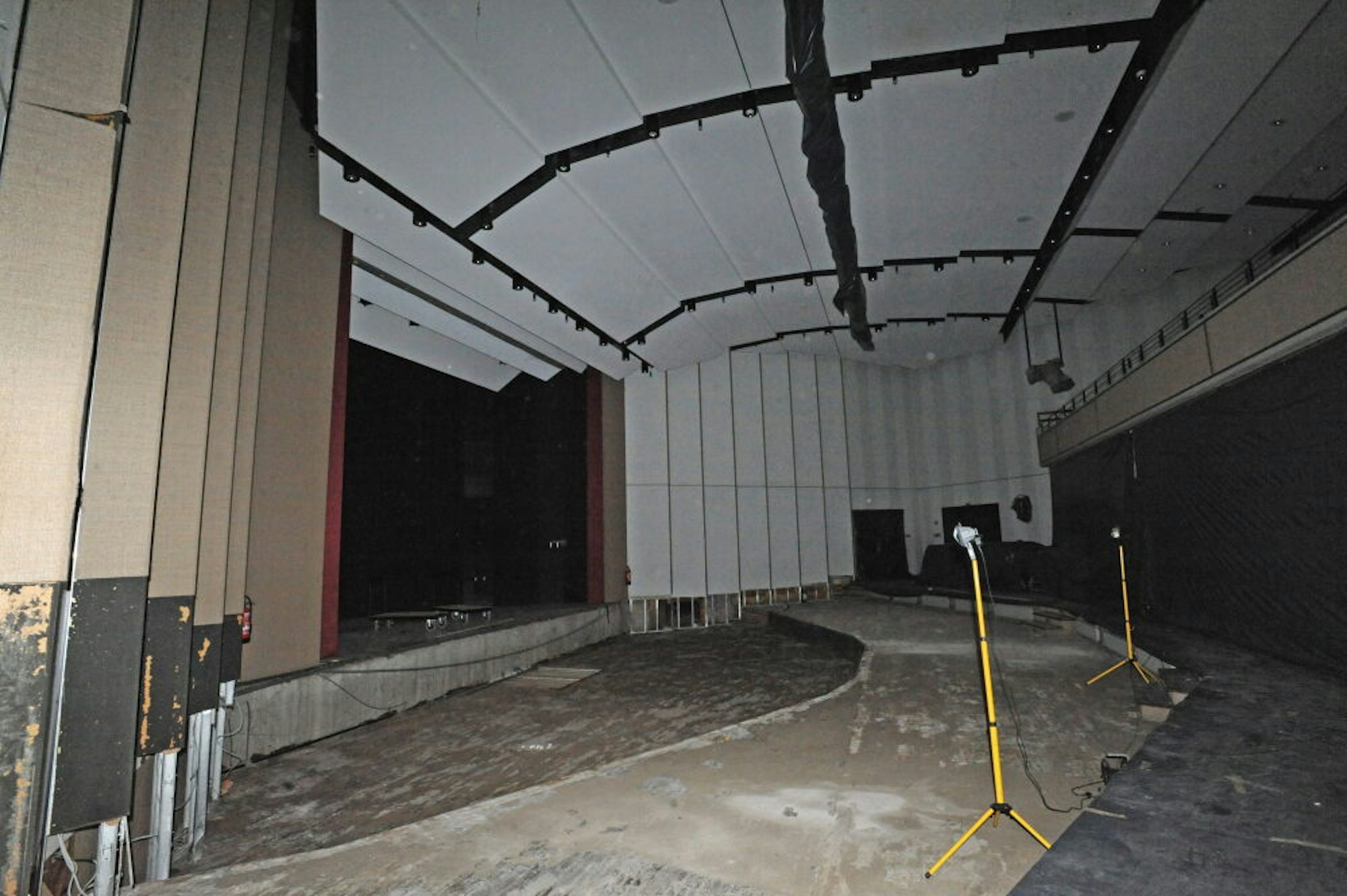 Blick in die entkernte Aula Am Hammer, die nach dem Hochwasser noch für lange Zeit nicht kulturell genutzt werden kann.