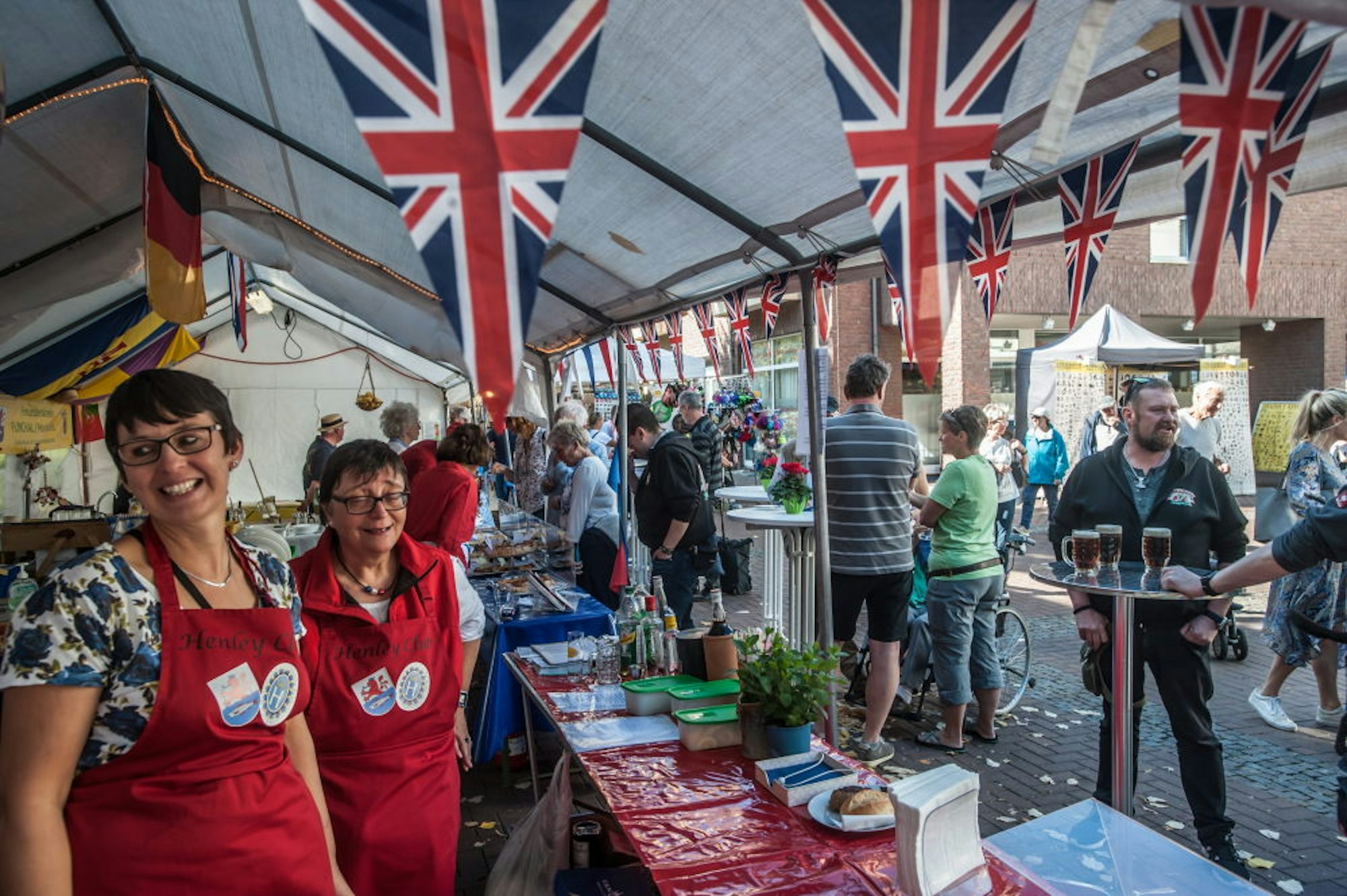 Von wegen Brexit! Wenn Leichlingen feiert, sind die Partnerstädte natürlich an einem gemeinsamen Stand vertreten – mit den jeweiligen Spezialitäten.