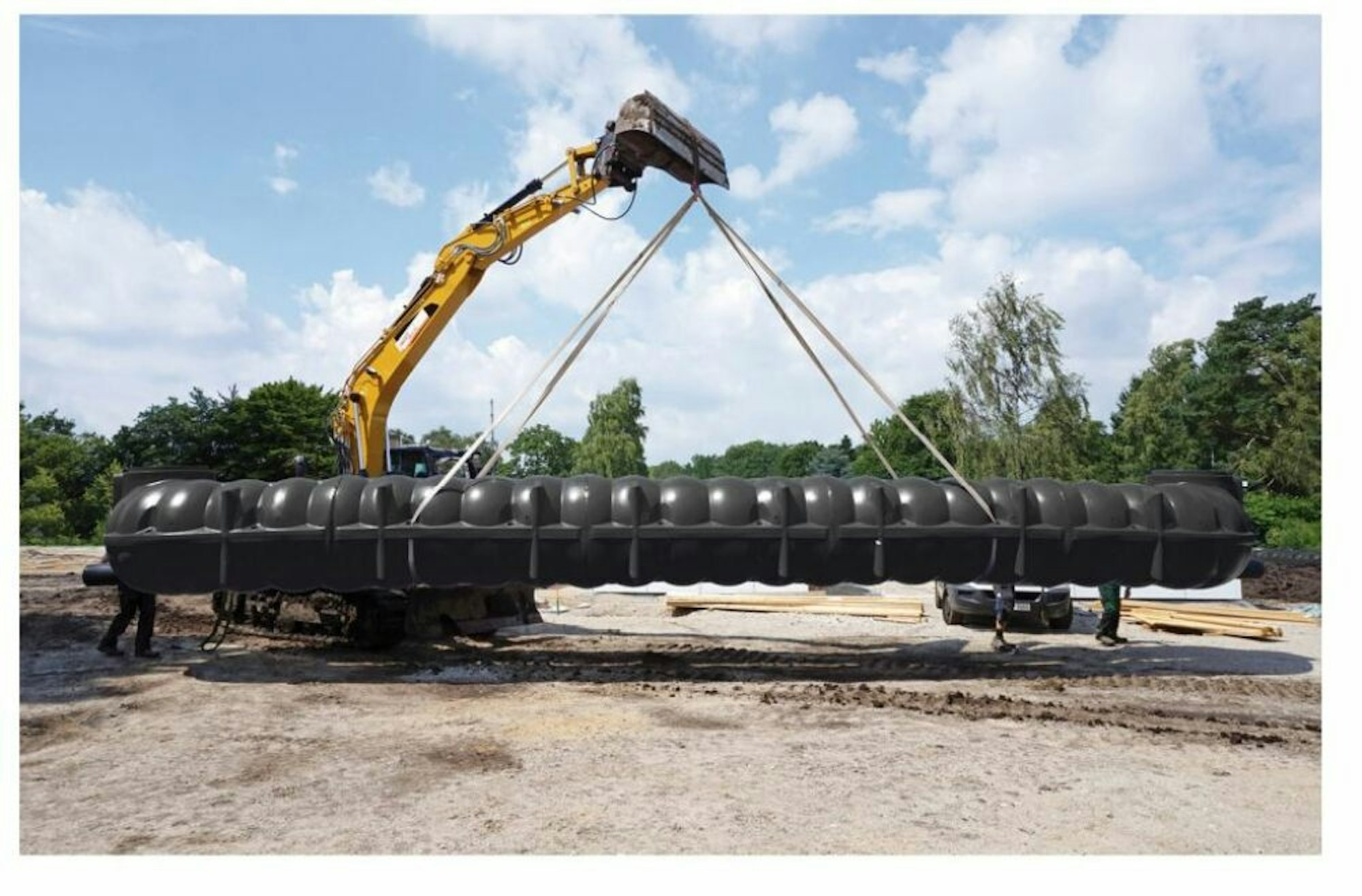 Zwei solcher Flachzisternen, die etwa 65 000 Liter Regenwasser fassen, werden unter dem Rasen des Stadtparks vergraben.