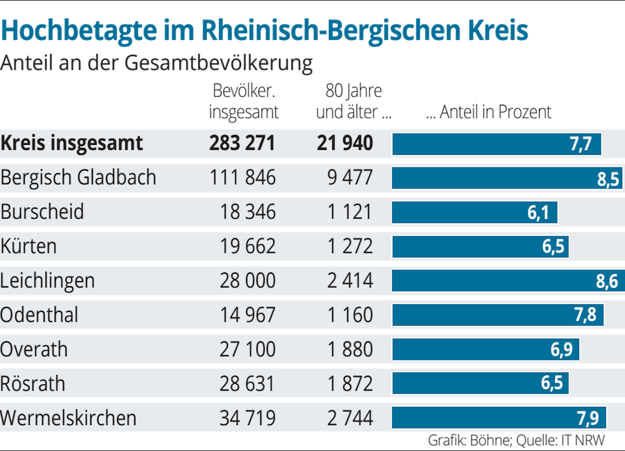 Innerhalb des Rheinisch-Bergischen Kreises ist die Verteilung von Seniorinnen und Senioren jenseits der 80 nicht einheitlich. Die prozentual meisten Hochbetagten leben in Leichlingen: 2414 Menschen, was einen Bevölkerungsanteil von 8,6 Prozent ausmacht und auch daran liegt, dass es mit dem Pilgerheim Weltersbach und dem Altenzentrum Hasensprungmühle zwei große Seniorenheime in der Blütenstadt gibt. Die wenigsten Hochbetagten leben laut der Kreis-Statistik in Burscheid (6,5 Prozent). Die Kreisstadt mit ihren zahlreichen Seniorenheimen liegt auf Platz 2.