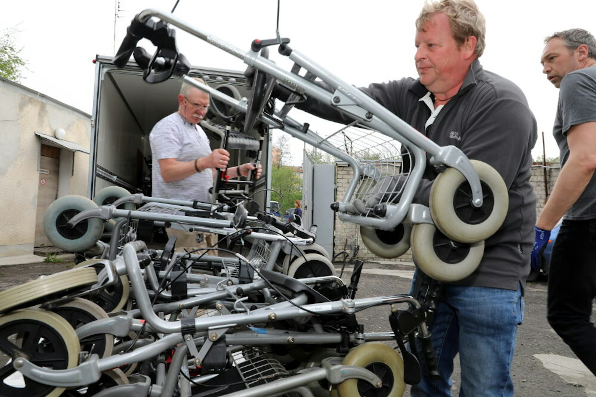 Dietmar Schur, Dirk Ballsieper und Heinz Bernd Padberg laden Rollatoren und Rollstühle aus einem der Konvoi-Anhänger, Marc Susewind und Dr. David Melchior, die den 40-Tonner-Sattelzug gesteuert haben, helfen dem ukrainischen Gabelstaplerfahrer beim Abladen der Paletten mit Nudeln, Reis, Haferflocken und Konserven.