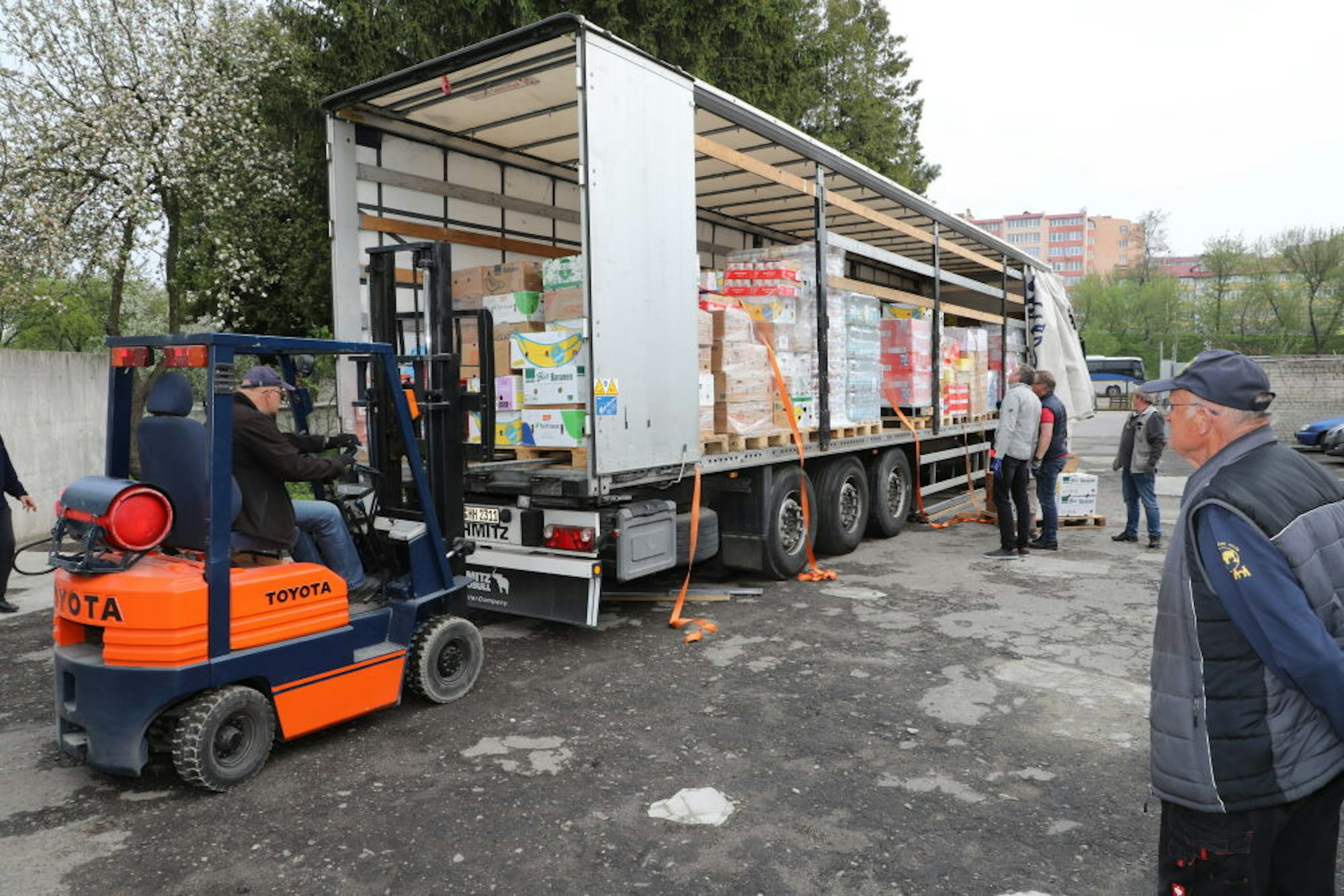 Der Konvoi am Ziel: An der Hilfsgüterhalle der Caritas in Lviv werden die Paletten mit Lebensmitteln, Medikamenten und anderen Hilfsgütern abgeladen.