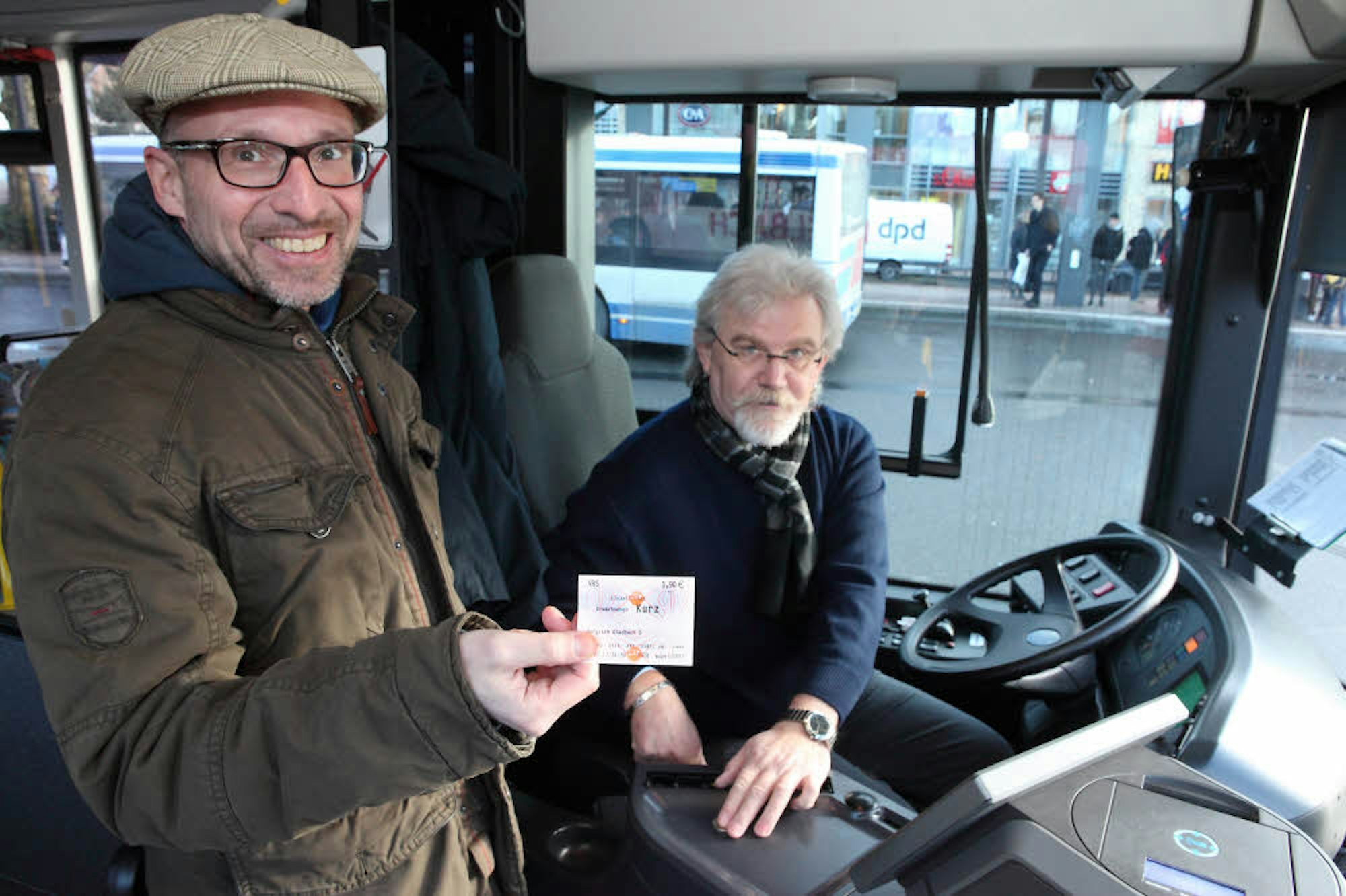 Die meisten Fahrgäste kaufen die Kurzstreckenkarte spontan, so wie es Redakteur Thomas Rausch bei Busfahrer Joachim Rott am Bahnhof in Bergisch Gladbach demonstriert.