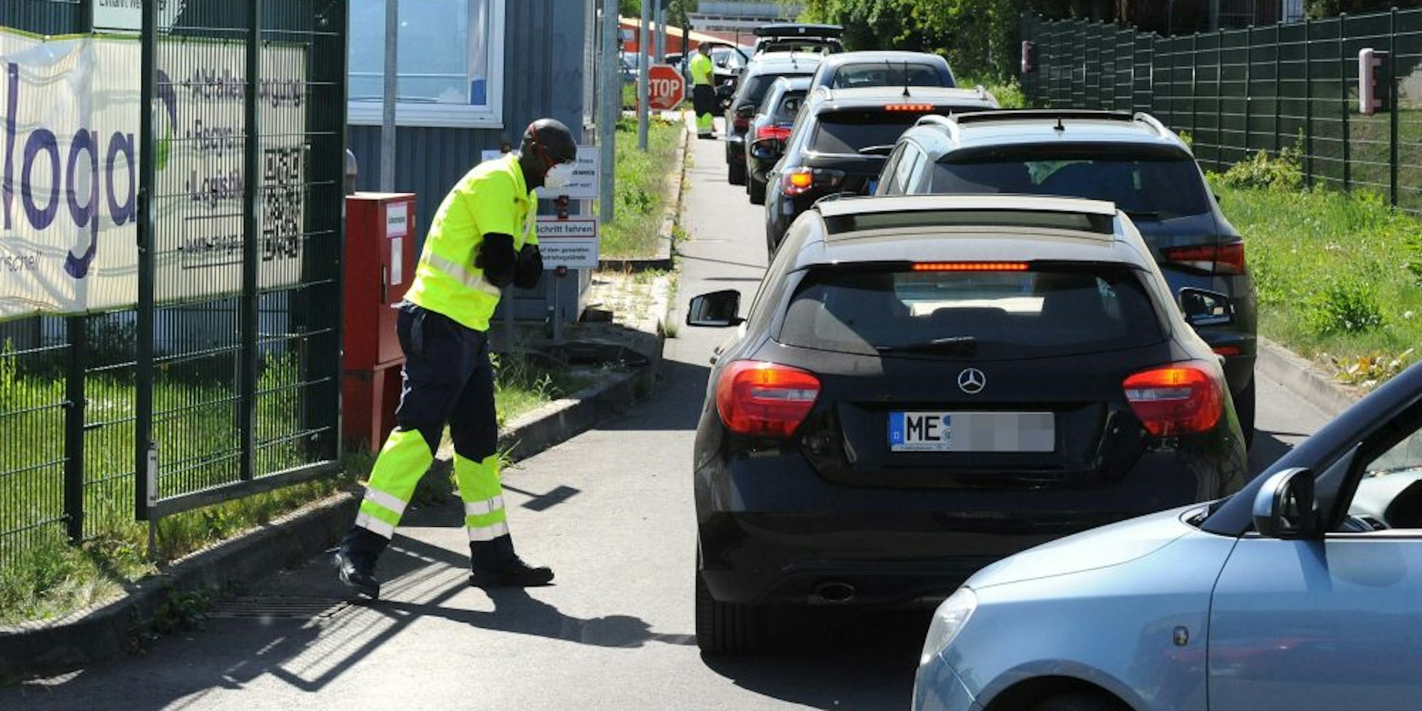 Einweiser mit Mundschutz am Leichlinger Wertstoffhof. 200 Meter weiter ist eine zweite Zufahrt geöffnet.