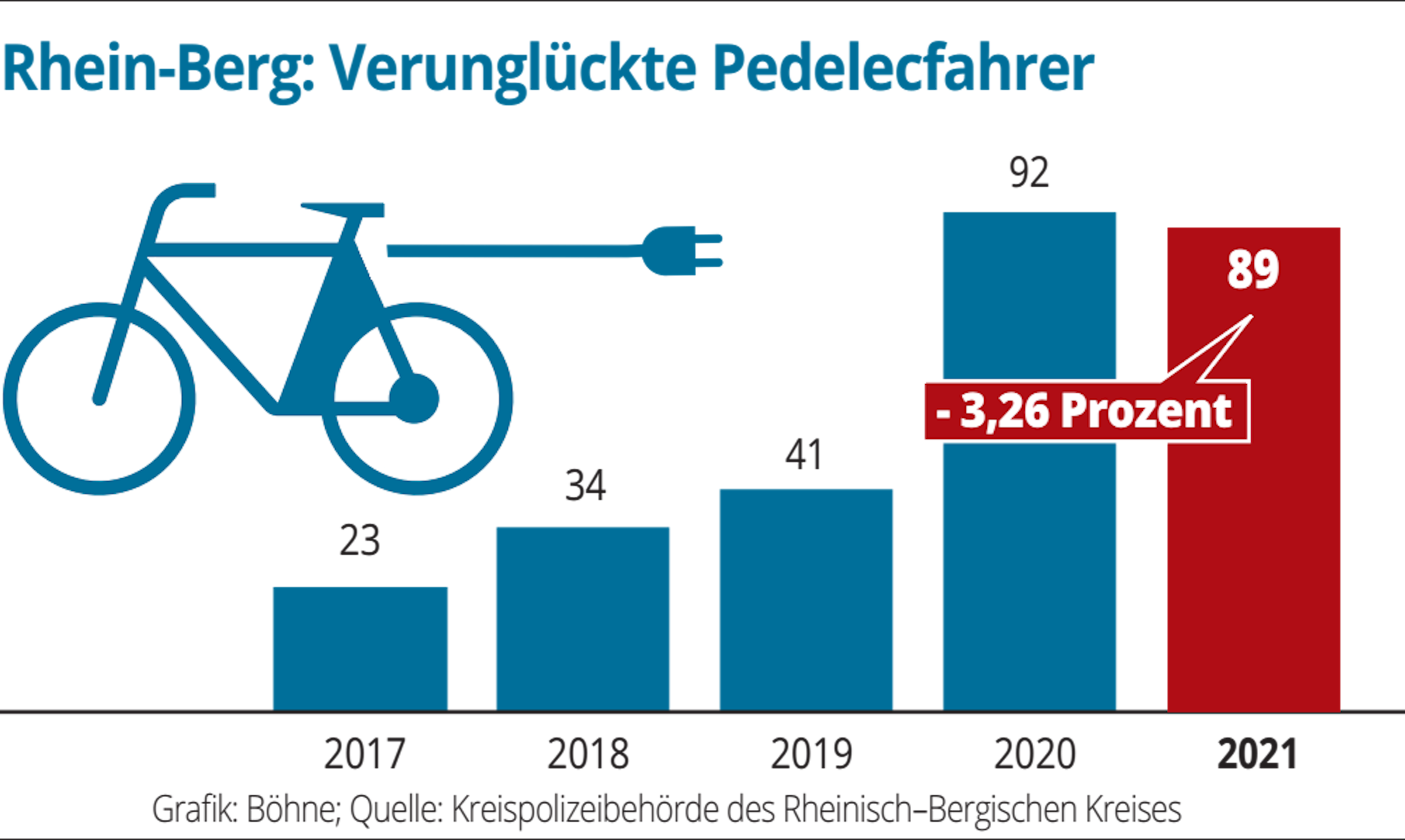 Unfälle mit Pedelecs und Fahrrädern: Bereits 2020 erreichte die Zahl der verunglückten Fahrrad- und Pedelecfahrer in Rhein-Berg mit 291 einen Rekordwert. Die Zahl der Verletzten ging zwar 2021 um drei bei den Pedelecfahrern auf 89 (siehe Grafik) und um 22 bei den Fahrradfahrern auf 173 zurück, liegt aber immer noch auf einem hohen Niveau. Und das Potenzial, so schätzt die Polizei, werde angesichts weiter steigender Käufe vor allem von Pedelecs noch zunehmen. Zu den häufigsten Ursachen bei den Unfällen mit „Bio-Rad“ oder Pedelec zählen Fehler beim Abbiegen, die verbotswidrige Benutzung von Fahrbahnen oder anderer Straßenteile wie Gehwege. Eine nahe liegende Vermutung angesichts der steigenden Zweiradunfälle konnte die Polizei allerdings auf Nachfrage nicht bestätigten: „Ein statistischer Zusammenhang mit schlechten Straßen sei nicht erkennbar“, so der Leiter des Verkehrsdienstes. Eins aber sei sicher: „Helmtragen rettet Menschenleben.“