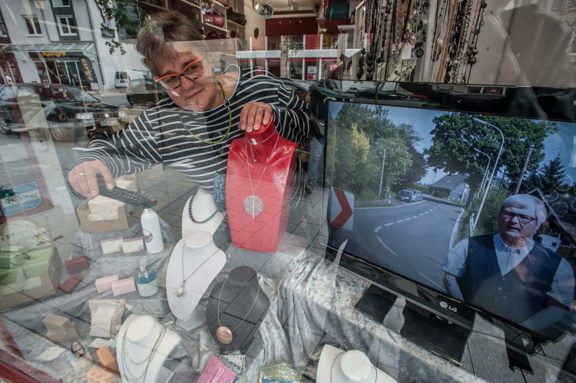 Claudia Hagen zeigt die Videos mit den Interviews im Schaufenster ihres Lädchens an der Oberen Hauptstraße.