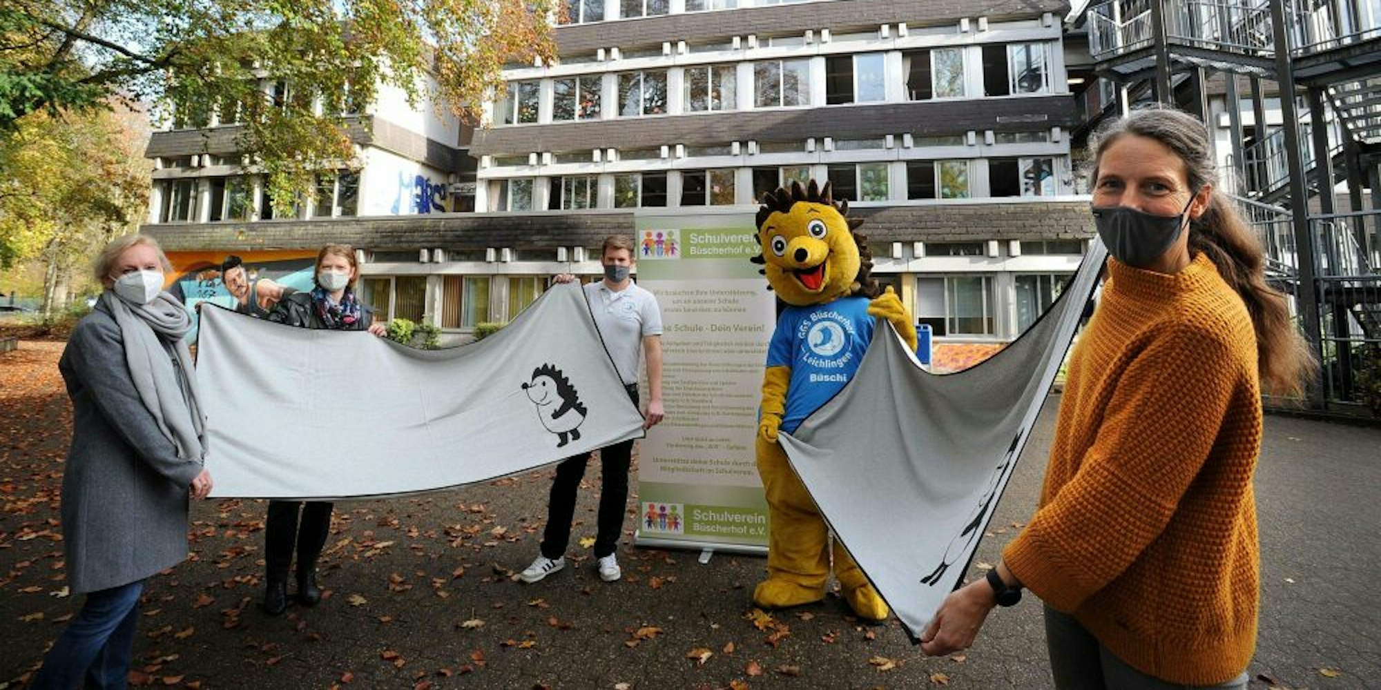 Rektorin Sandra Richter (v.l.) und Isabella Klein (VR-Bank) bei der Übergabe der mit dem Igel-Logo verzierten Decken durch den Schulvereins-Vorsitzenden Sebastian Lemmer und seine Vorstands-Kollegin Annette Bruns von der Modefirma Langbrett – mit Maskottchen Büschi.