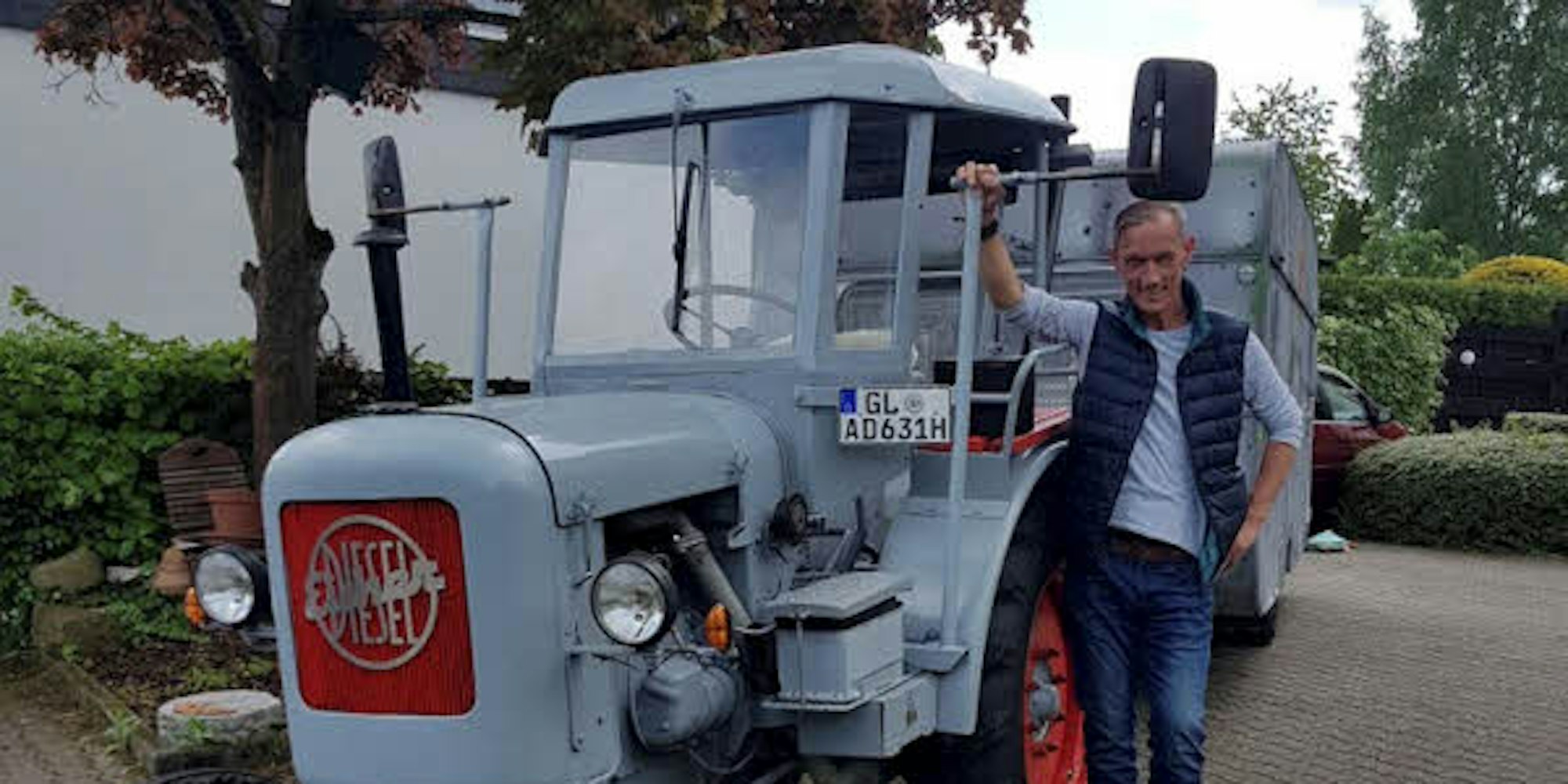 So oder so ähnlich muss es Andreas Wengel seit etwa neun Tagen gehen. „Von Leichlingen up to Ireland“, das steht hinten auf diesem ratternden Ding, mit dem er auch mit Vollgas noch ein lächelndes Smiley von sämtlichen Tempo-Displays an Grundschulen erhält: Es ist ein Traktor aus 1975, an den Wengel ein Wohnmobil gehängt hat. Nachdem er Job und Wohnung gekündigt hat. Und mit dem er nach Irland fahren will. Nach sieben Tagen Fahrt auf dem Traktor ist er bereits in den Niederlanden angekommen, sitzt an der Maas, schaut aufs Wasser. Wann er sein Ziel, Irland, erreicht? Keine Ahnung. Ist doch auch egal, oder?