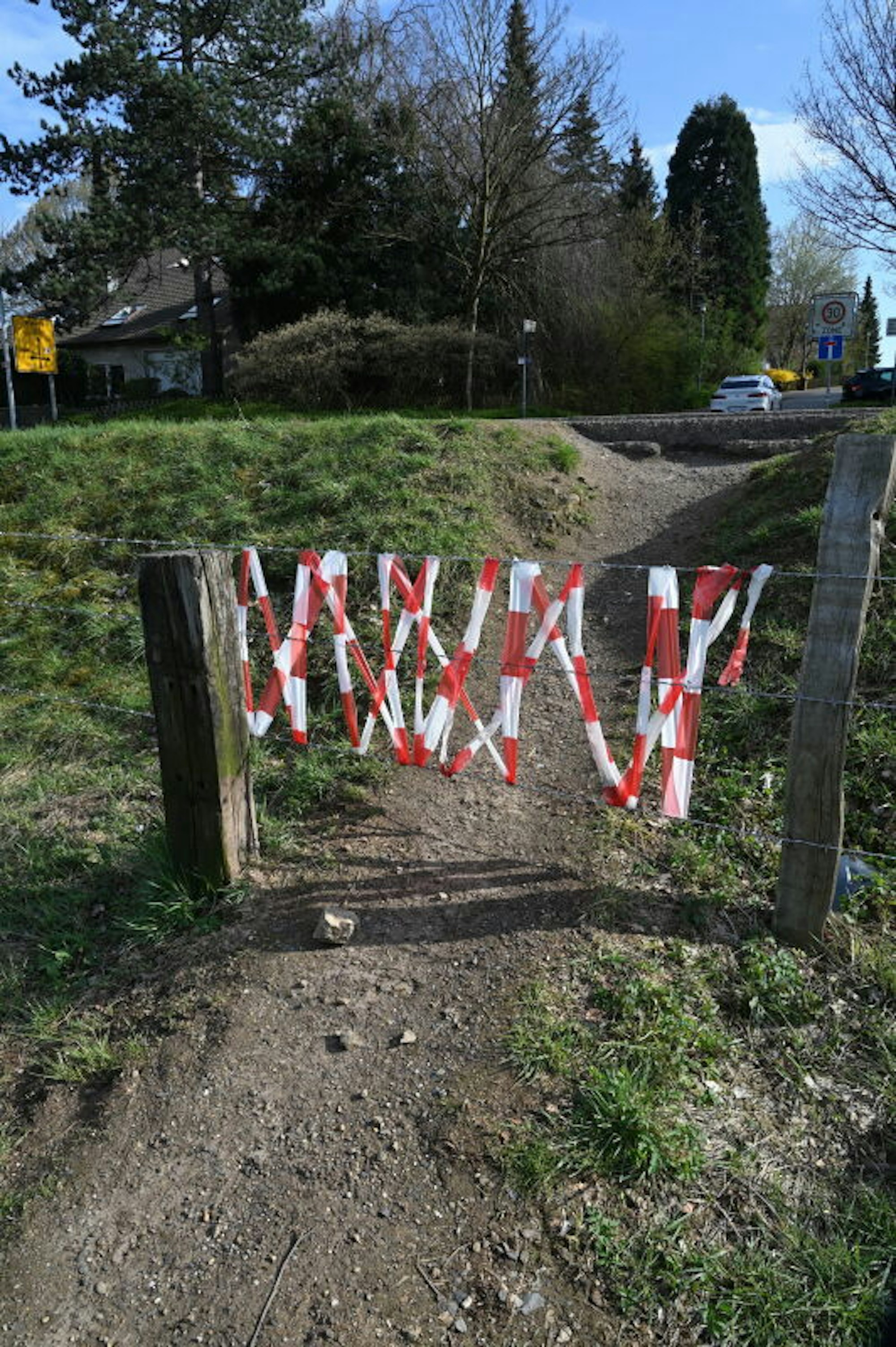 Flatterband am Zaun soll die Spaziergänger davon abhalten, die Wiesen zu betreten.
