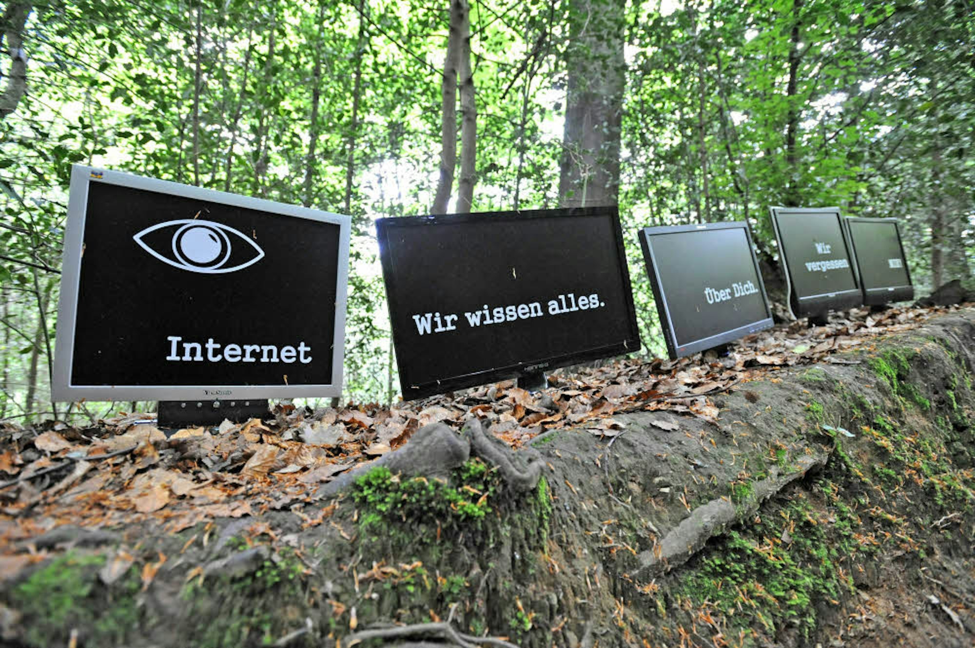 Hans Peter Küppersbusch warnt vor jener Neugier, die das Internet an den Tag legt, indem es Informationen der Menschen sammelt und für immer speichert. Manfred Boelke verfolgt einen ähnlichen Ansatz mit seiner „Deus Ex Virtual“-Krake: Sie hat die Welt mit ihren virtuellen Fangarmen im Würgegriff. In Ela Schneiders Holzskulpturenbaum kann jeder, der sich neugierig auf die Suche macht, einen kleinen Schatz entdecken.