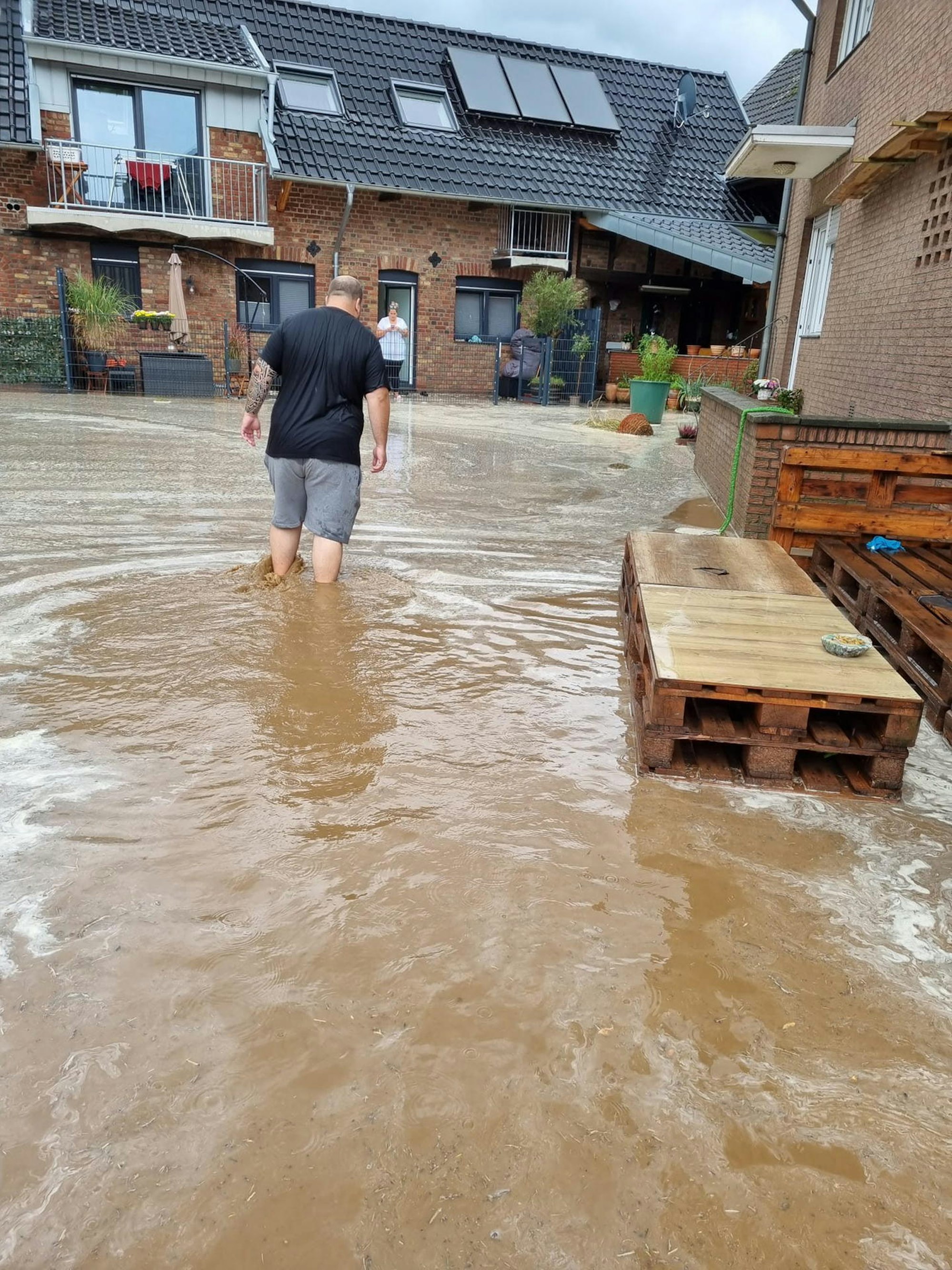Über die Rödinger Straße drängte das Wasser weiter über die Heinsberger Straße in das Dorf. „Das war hier wie im Wattenmeer“, sagt Sascha Marquardt, der am Freitag durch den Schlamm im Hof gewatet ist. Gullydeckel seien aufgetrieben und Mülltonnen umhergeschwommen.