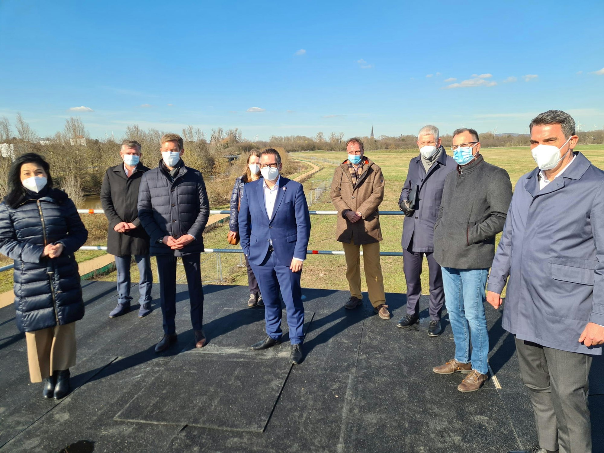 Blick vom Gerüst auf das zu bebauende Areal: Auch Staatssekretär Christoph Dammermann (3.v.r.) informierte sich darüber, was auf dem früheren Gelände der Bedburger Zuckerfabrik entstehen soll.