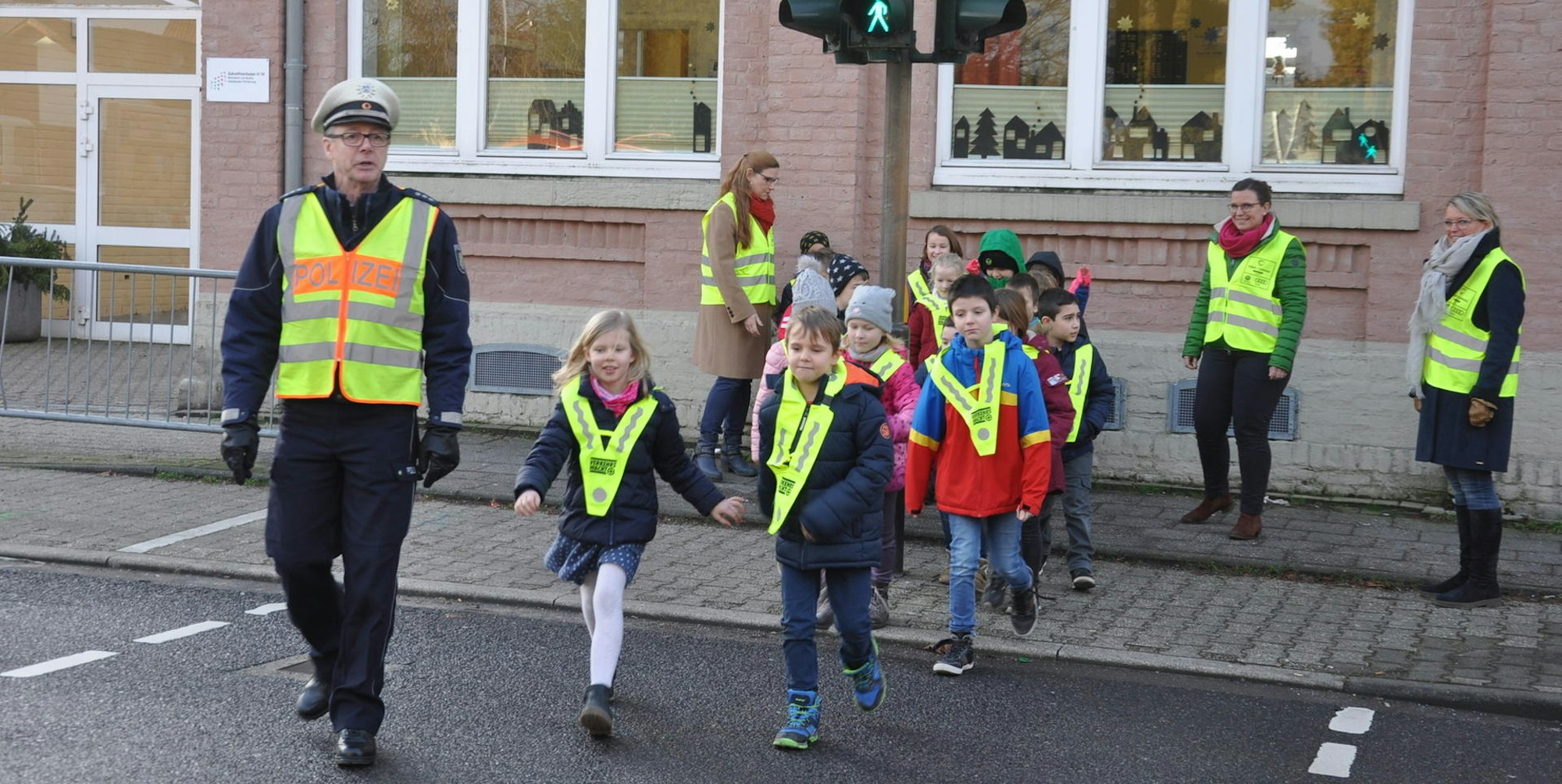 „Was machen wir, bevor wir über die Straße gehen, auch bei Grün für die Fußgänger?“, fragt er die Schüler beim Gang über die Straßen rund um die Schule an der Kölner Straße. Viele Zeigefinger schnellen in die Höhe, denn Tolksdorf hat bei seinen regelmäßigen Besuchen in der Schule gute Arbeit geleistet. „Nach links und rechts schauen“, ertönt es gut gelaunt.