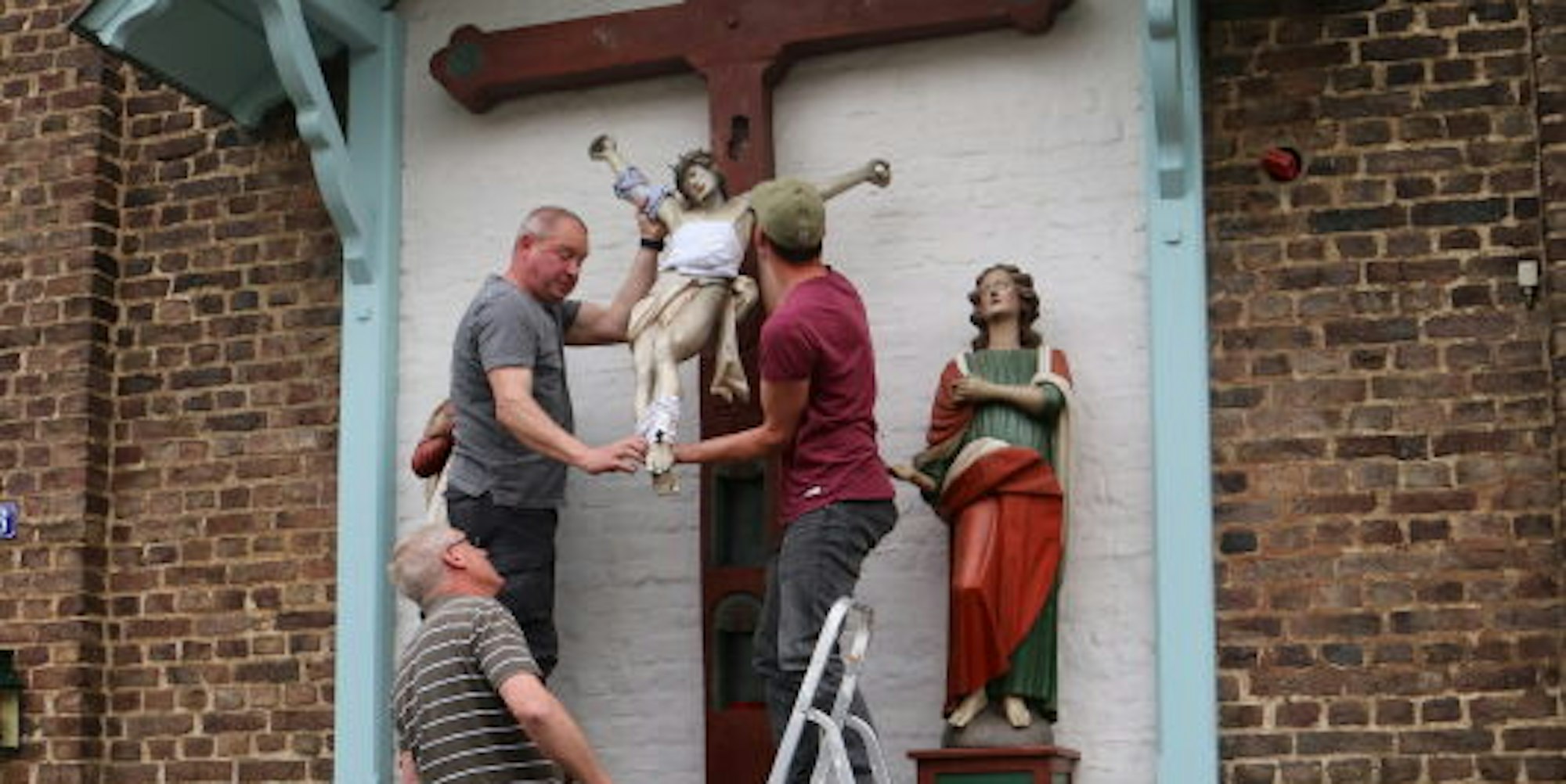 Bedburg-Kaster – Der Korpus hatte doch schwer gelitten, und so kam es, dass Jesus in Alt-Kaster vom Kreuz genommen wurde: Die Skulptur des Erlösers aus der Kreuzigungsgruppe auf der Hauptstraße gegenüber der Georgskirche musste dringend restauriert werden.