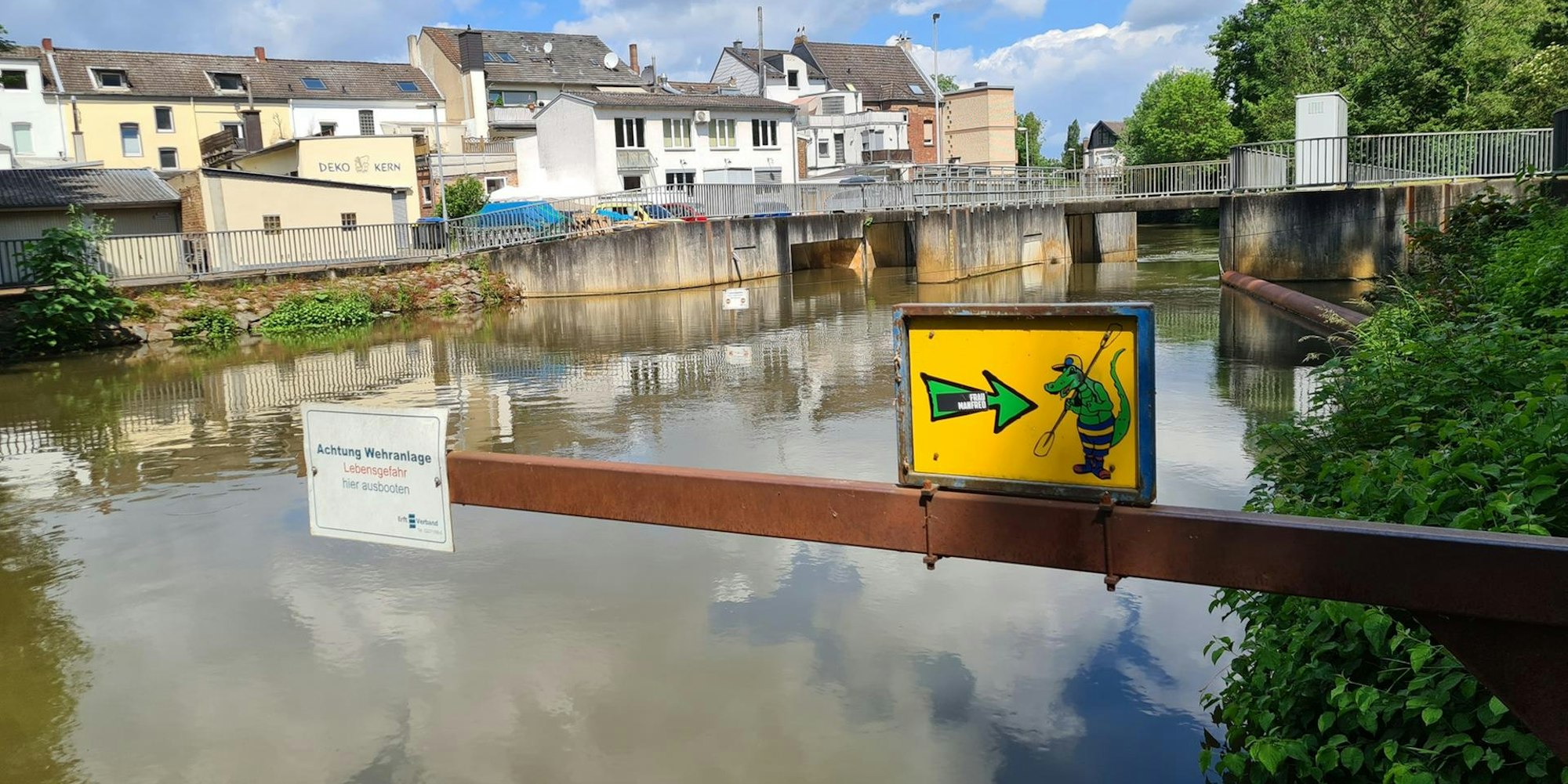 „Das Wasser stürzt an den Wehren über die Staustufe hinab, sodass hier eine Rückströmung entsteht“, sagt Timo Schneider vom Erftverband. Vor dem Wehr gebe es mehrere Schilder mit Warnungen und dazu auch noch in niedriger Höhe eine Notfallleine aus Metall quer über die Erft, an der man sich festklammern und ans Ufer ziehen könne. „Wenn man daran einmal vorbei ist, wird es schwer. Dann besteht die Gefahr, dass man über das Wehr getrieben und in der Walze gefangen wird.“