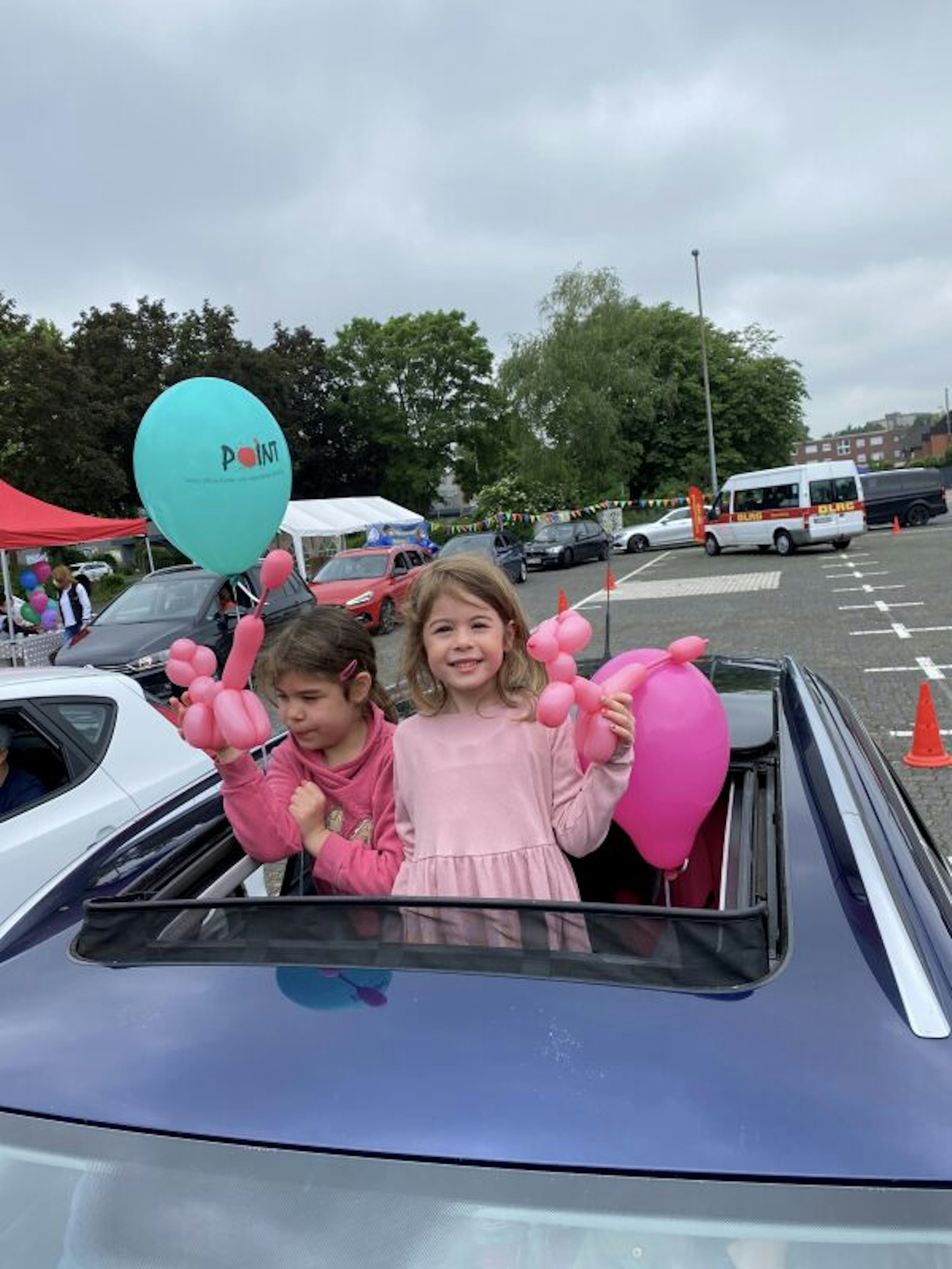Das kostenlose Fest fand also nicht wie sonst am Schloss Bedburg statt, sondern als Drive-in-Autoparcours. „Ich bin begeistert, wie schnell die Leute improvisieren und auf welche Ideen sie kommen“, so Bürgermeister und Schirmherr Sascha Solbach. Die Familien mussten sich vorher anmelden und eines der 30-Minuten-Zeitfenster reservieren. Im Halbstundenrhythmus fuhren jeweils 30 Fahrzeuge über den großen Parkplatz an der Tennishalle. 390 Kinder waren angemeldet.