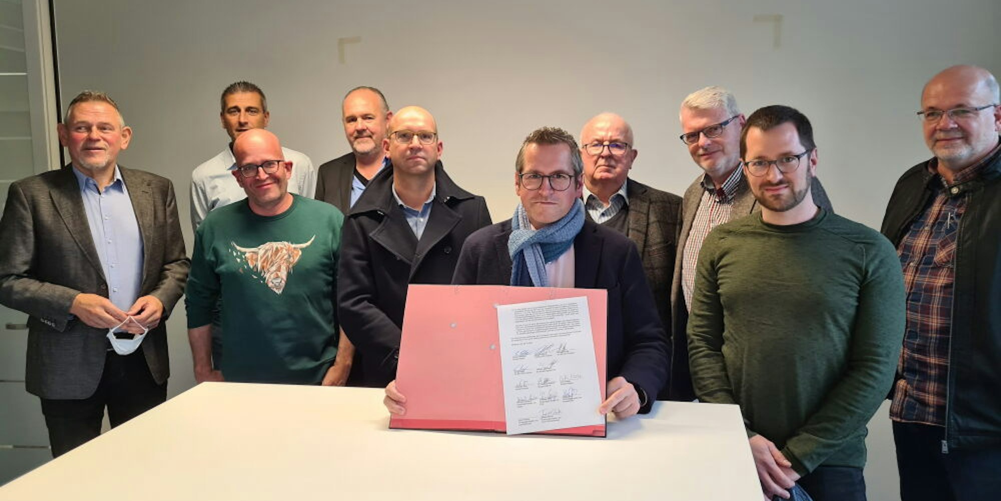Bürgermeister Sascha Solbach mit der Vereinbarung, die von ihm, von Ratsmitgliedern, Vertretern der Bürgerinitiative und von Ortsbürgermeistern unterzeichnet wurde.