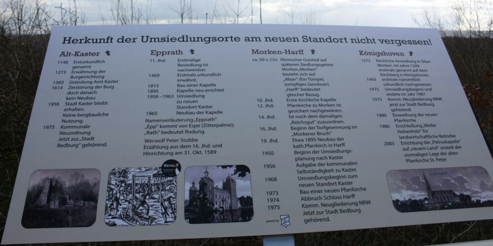 Auf der Kasterer Höhe wurde laut Verwaltung ebenso eine Informationstafel mit geschichtlichen Erläuterungen zu den Ortschaften Alt-Kaster, Epprath, Morken-Harff und Königshoven und zur Umsiedlung auf dem Bedburger Stadtgebiet gestohlen. Die Tafel war vom Bautrupp des SC Borussia Kaster/Königshoven aufgestellt worden.