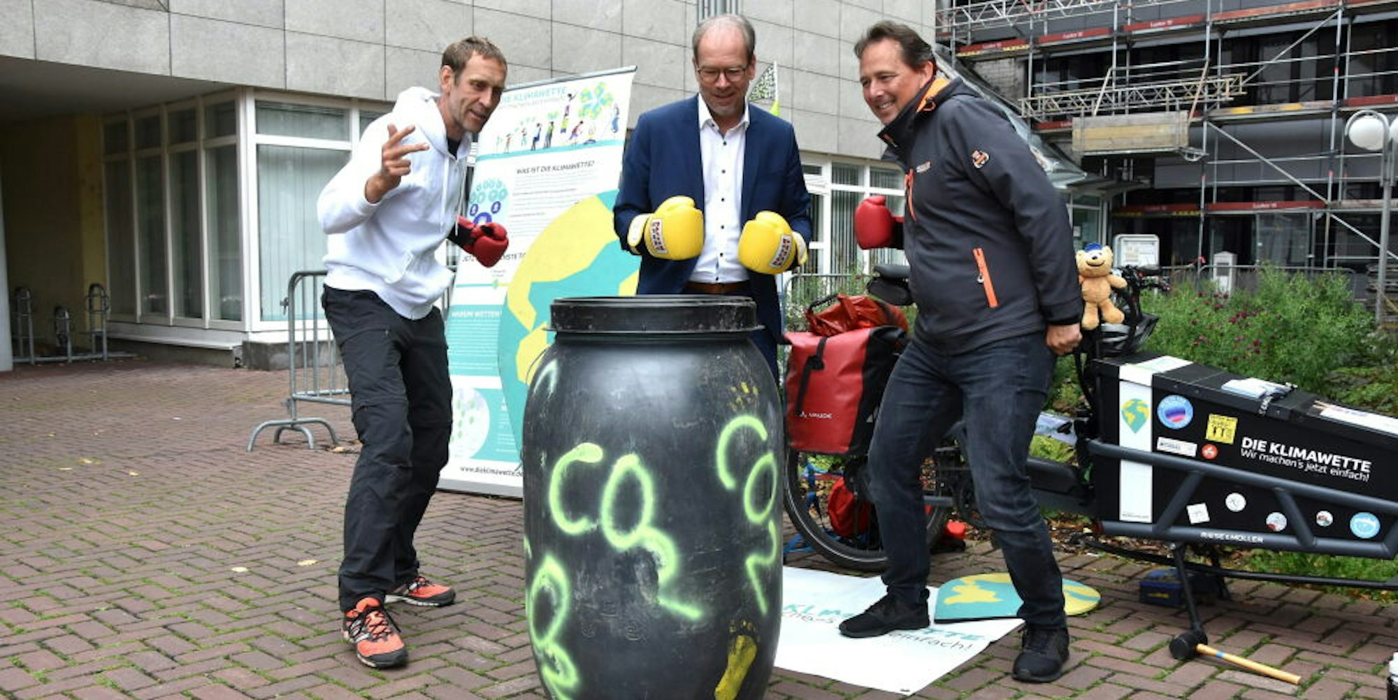 Volker Mießeler (M.) und Christian Brink (r.) boxten nicht nur eine symbolische CO2 -Tonne weg, sie nahmen auch Michael Bilharz’ Klimawette an.