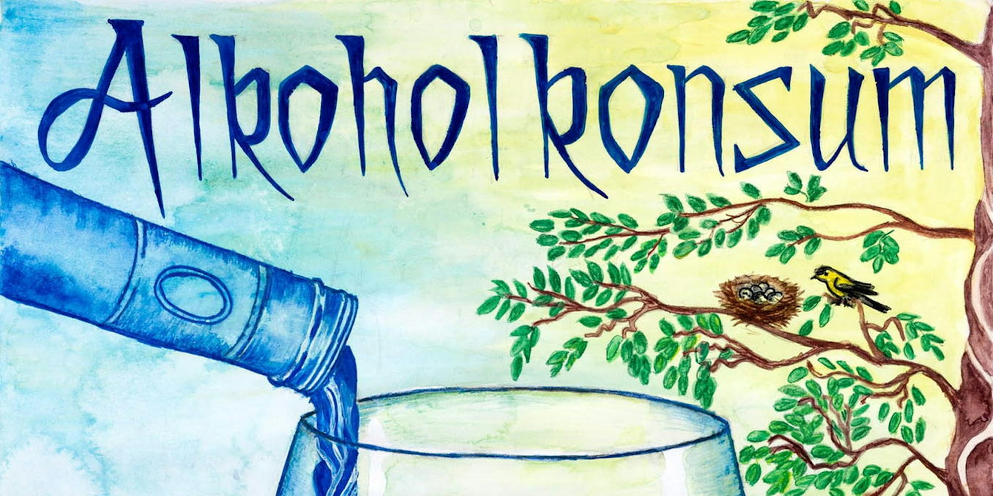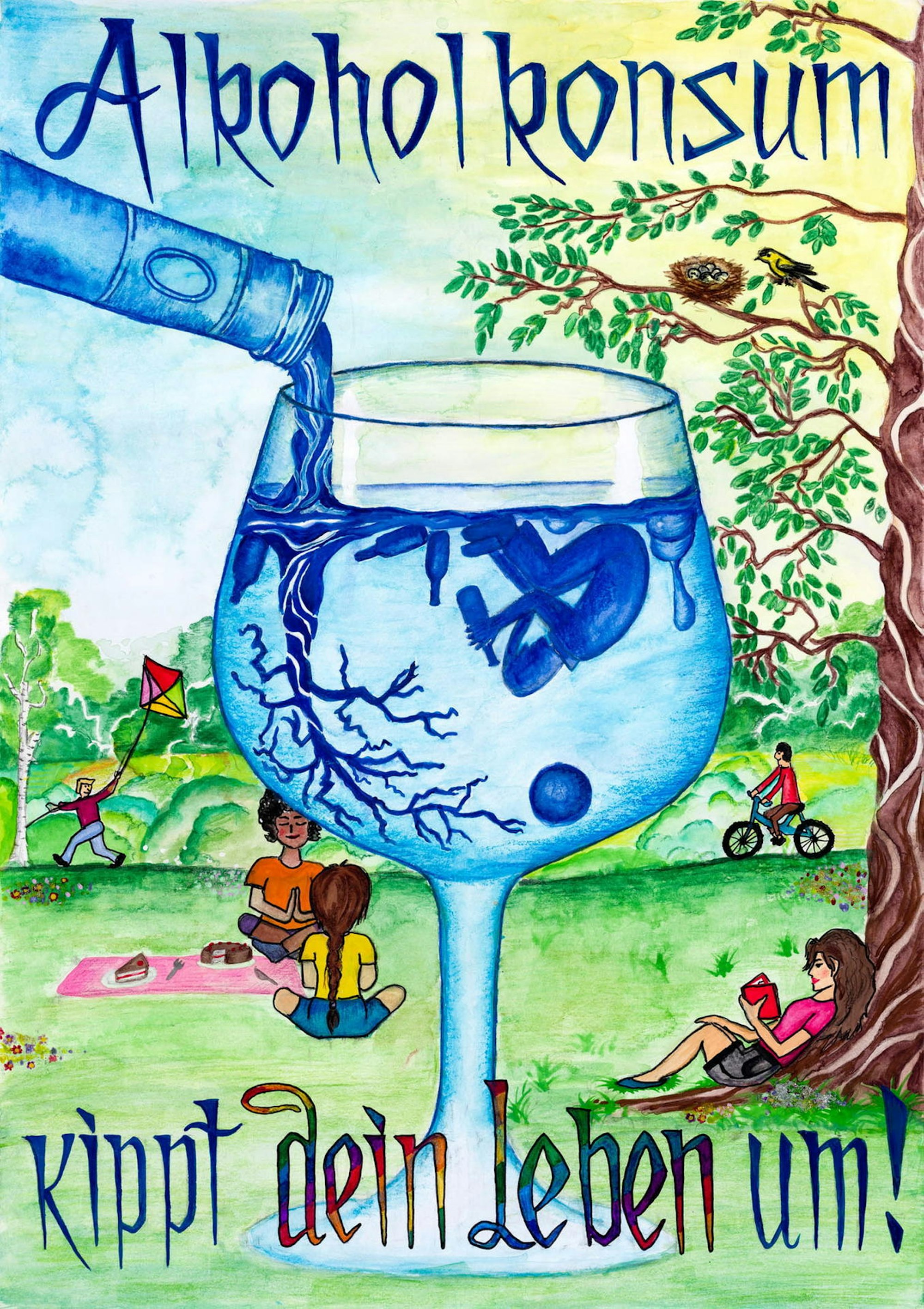Sie hat ein Weinglas gemalt, in das ein alkoholisches Getränk gefüllt wird. Unter dem Flüssigkeitsspiegel bildet sich daraus auf dem Kopf stehend das Bild eines Menschen, umgeben von Flaschen und offenbar am Ende. Dazu Sophie Berner den der Schriftzug: „Alkoholkonsum kippt dein Leben um“.